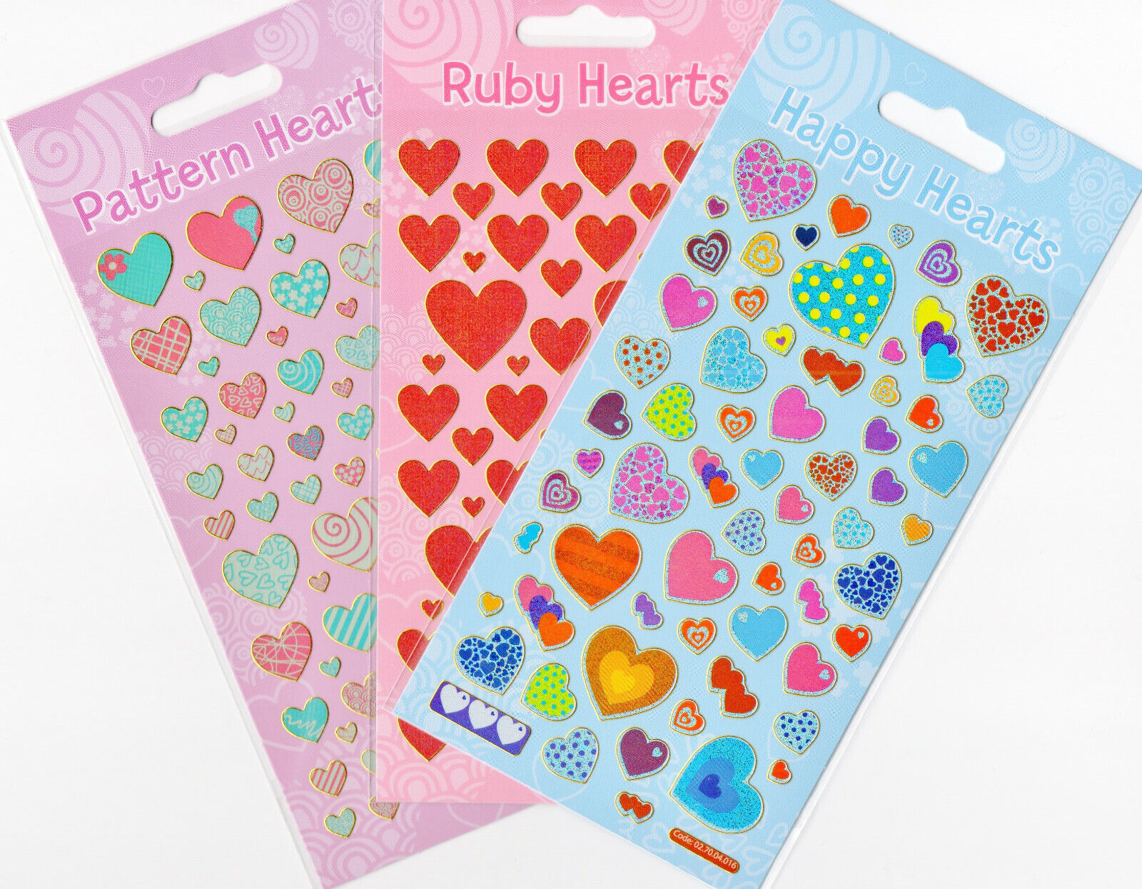 Glittery heart stickers, single sheets or mixed packs of various pretty patterns.
