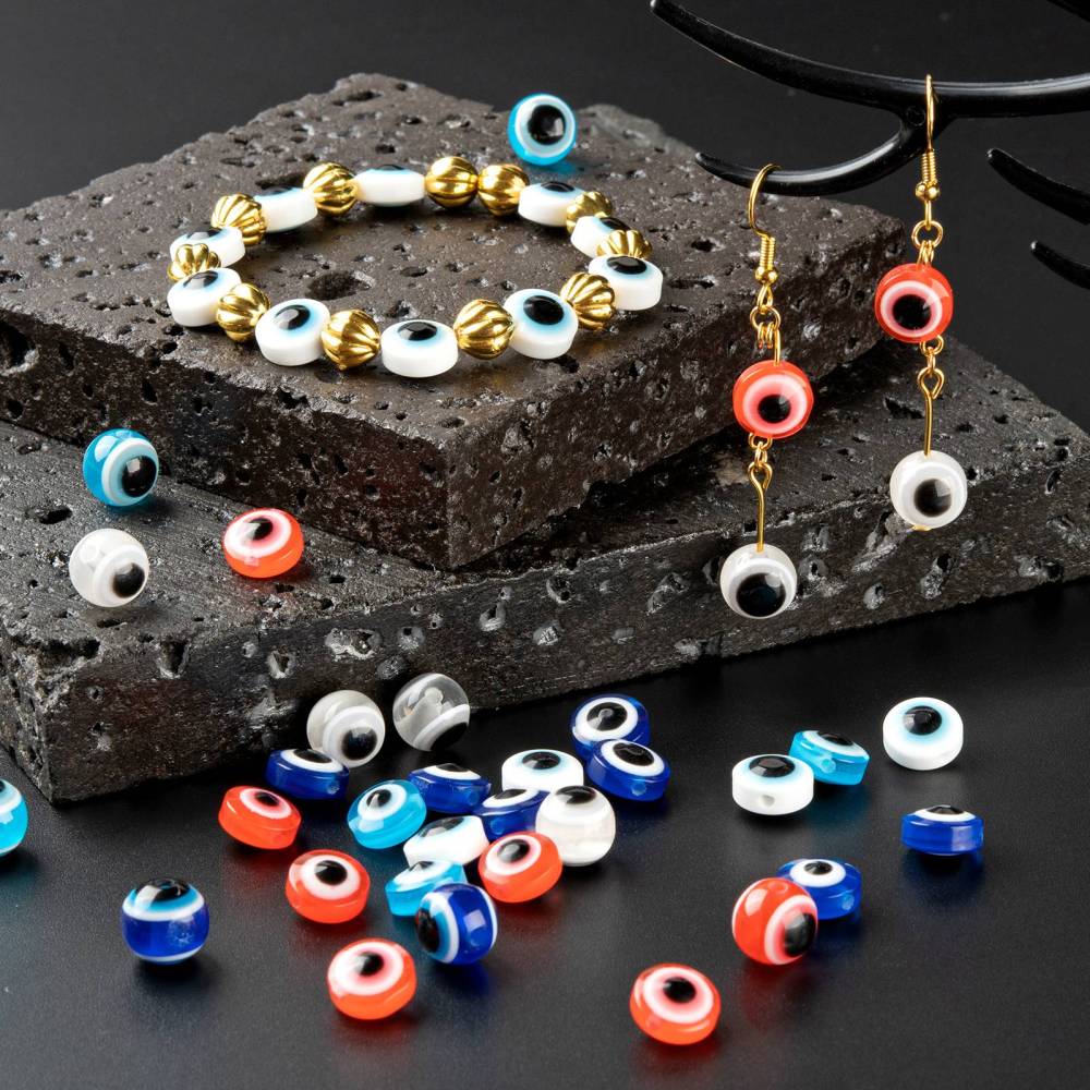 - Details: Details: Flat round evil eye beads: approx 10mm~11mm x 5mm~7mm, hole: approx. 2mm. 4 colours, 20pcs/colour, (total 80pcs) ; Round evil eye beads: approx. 10x9mm, hole: 1.8~2mm. 4 colours, 12pcs/colour (total 48pcs)