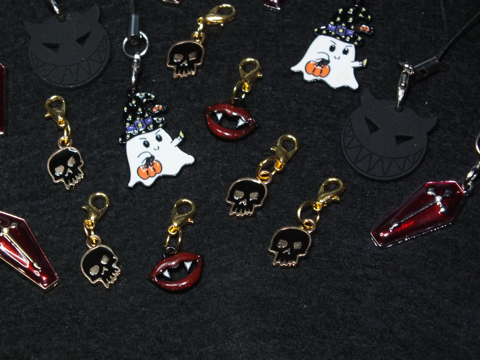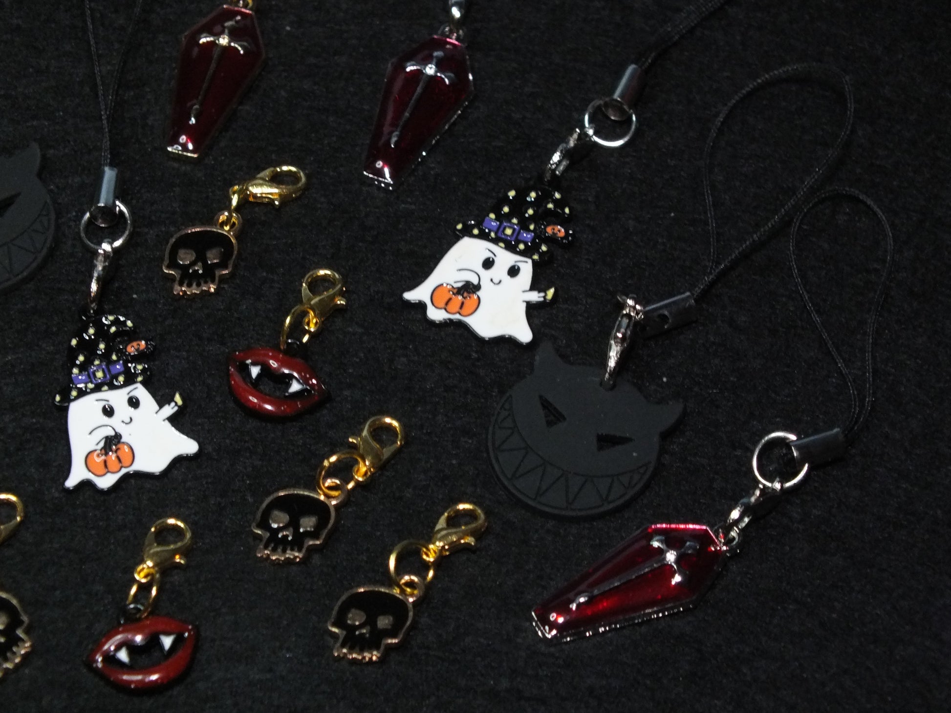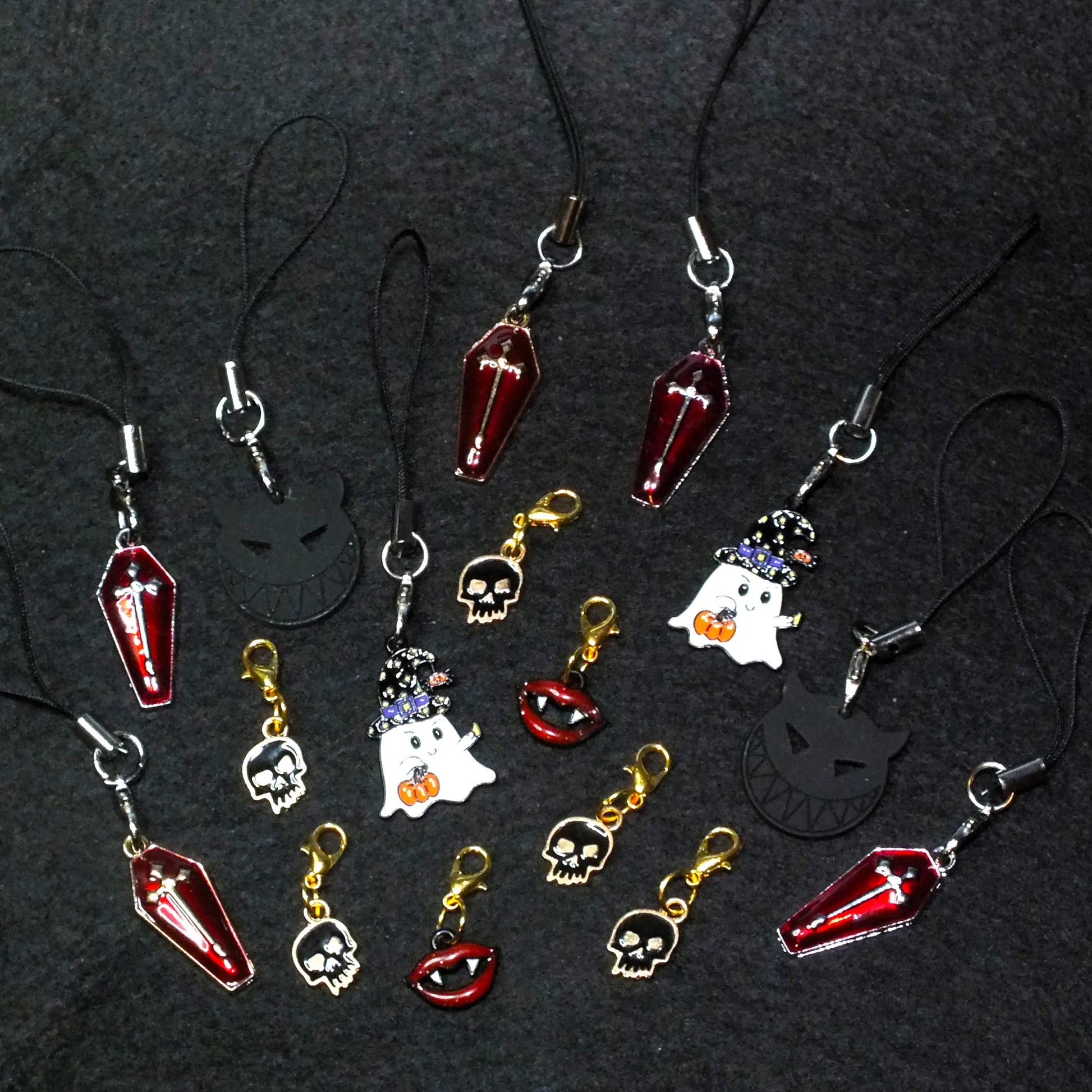 Charm type - Handmade Halloween themed lanyard dangle charms for phones, bags or keys. Assorted charms, large and small, metal skulls, demons, coffins, vampire teeth, ghosts, mostly enamelled. A fun mix pack for your trick or treaters!