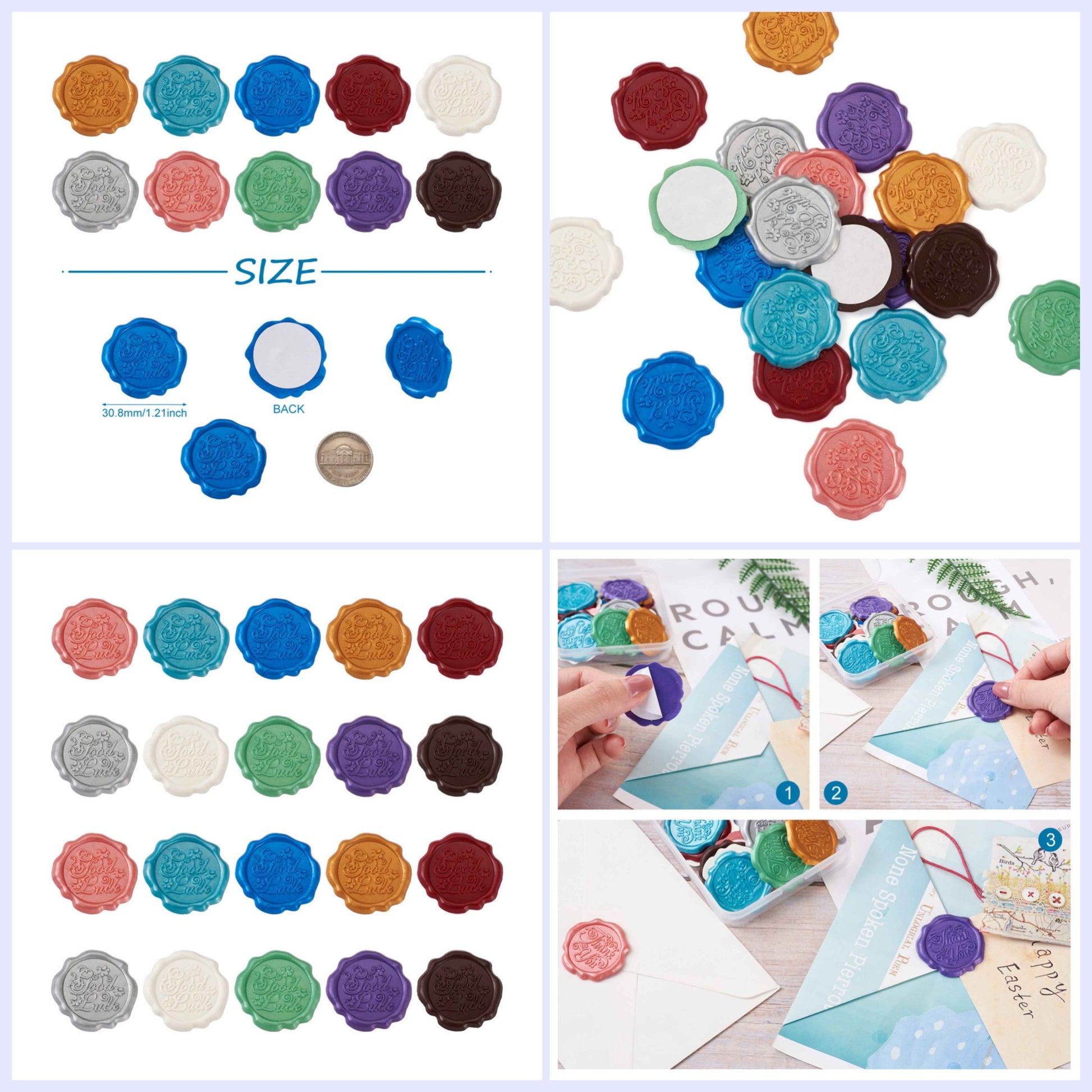 - Details: Randomly coloured wax seals with adhesive backing, multicoloured with "GOOD LUCK" motif.