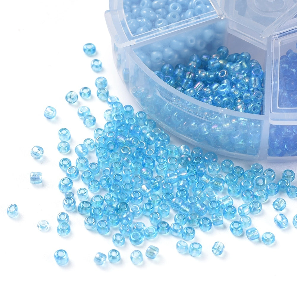 6 compartments of glass seed beads, approx. 10g weight per colour. Seeds are 3mm in diameter with a hole approx. 1mm. Total about 1,330pcs/box.