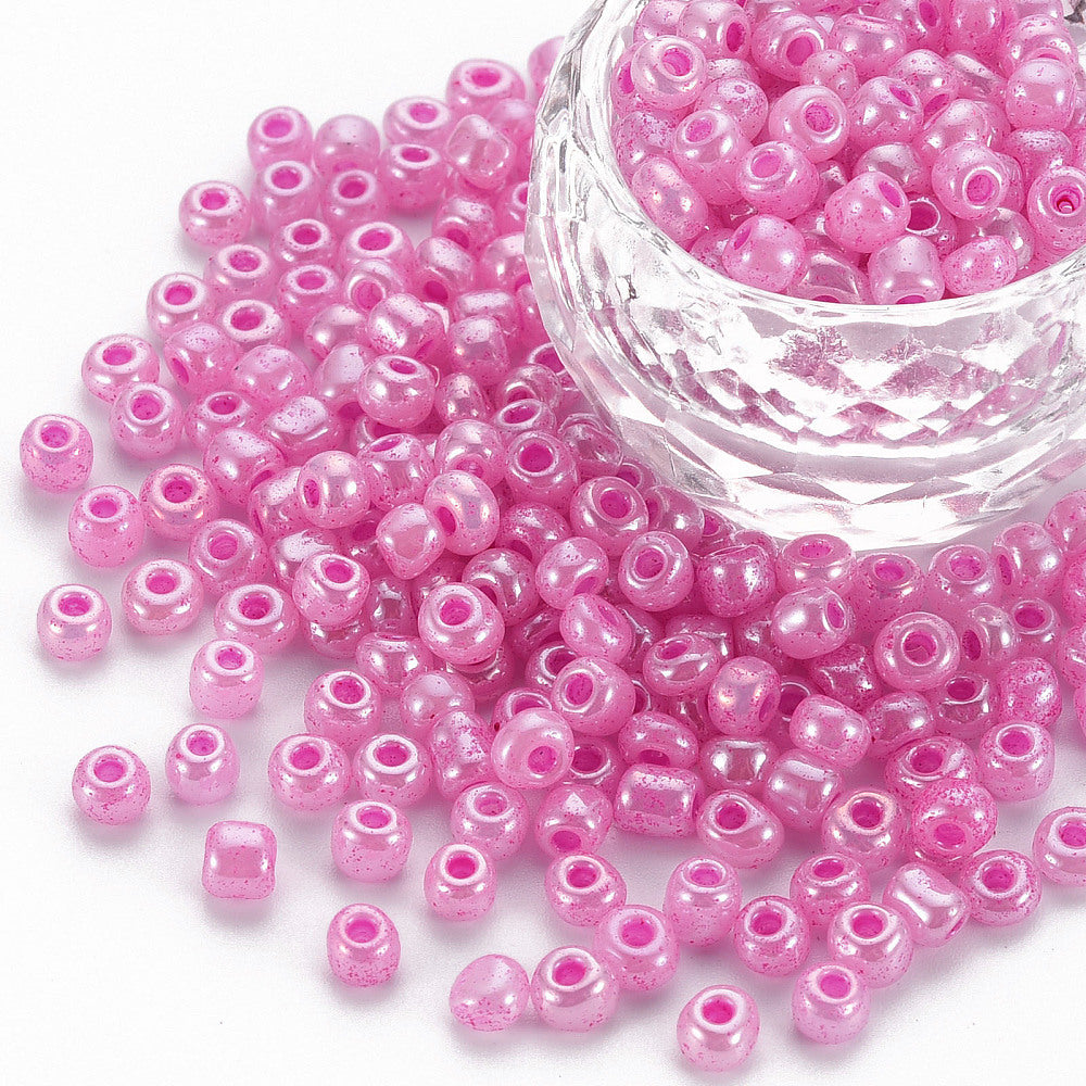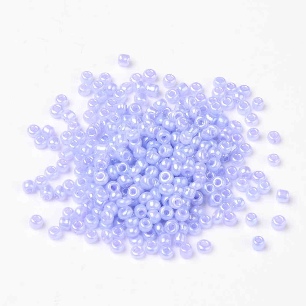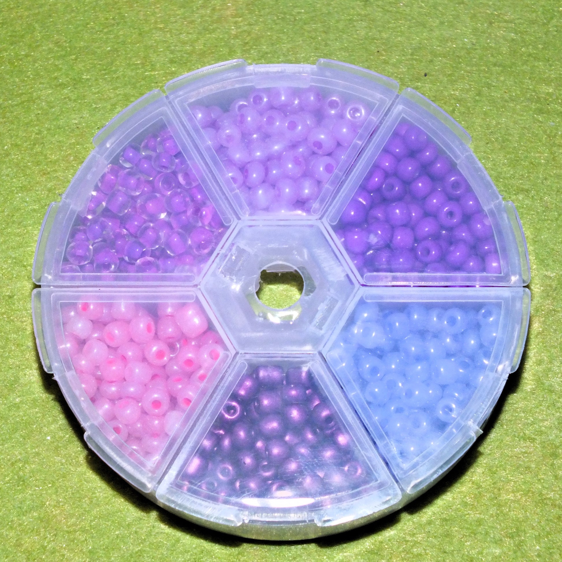 - 6 compartments of glass seed beads, approx. 9g weight per colour. Seeds are 4-5mm x 3.5-4mm in diameter with a hole approx. 1-1.5mm.