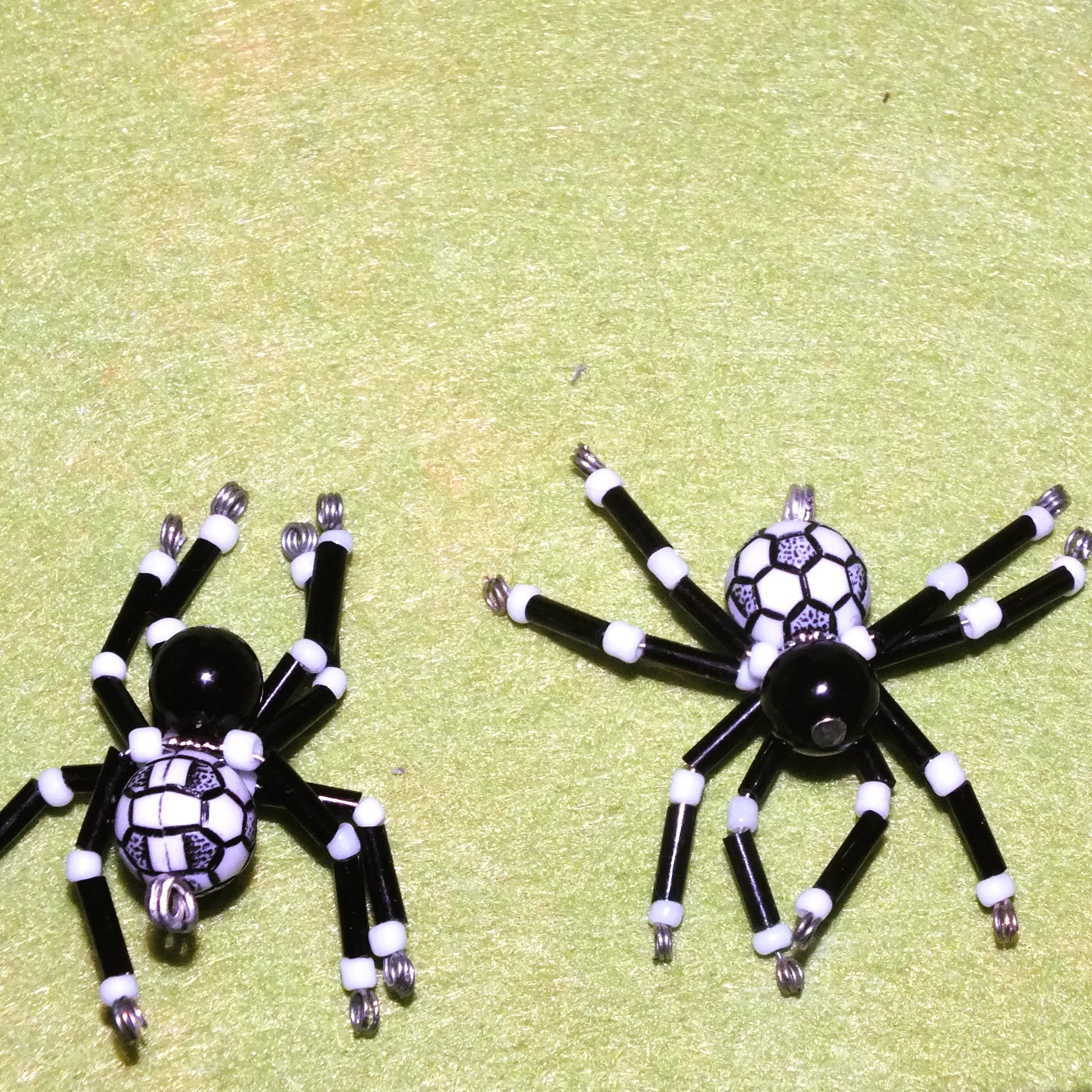 - Each spider is approx. 40mm in size, made from wire and beads (usually glass, some bodies/heads are acrylic), and come with a loop on the rear to attach jump rings, lanyards, clasp, keyrings or similar.