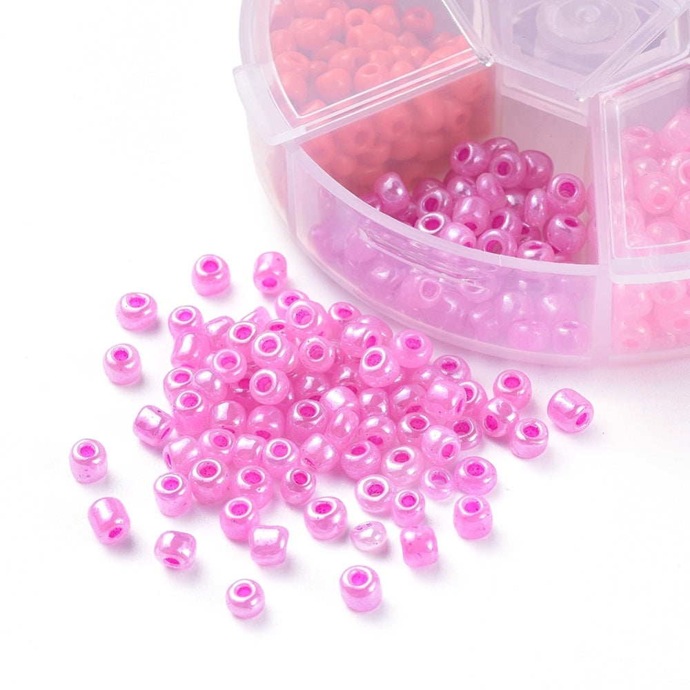 6 compartments of glass seed beads, approx. 10g weight per colour. Seeds are 4mm in diameter with a hole approx. 1-1.5mm. Total about 600pcs/box.