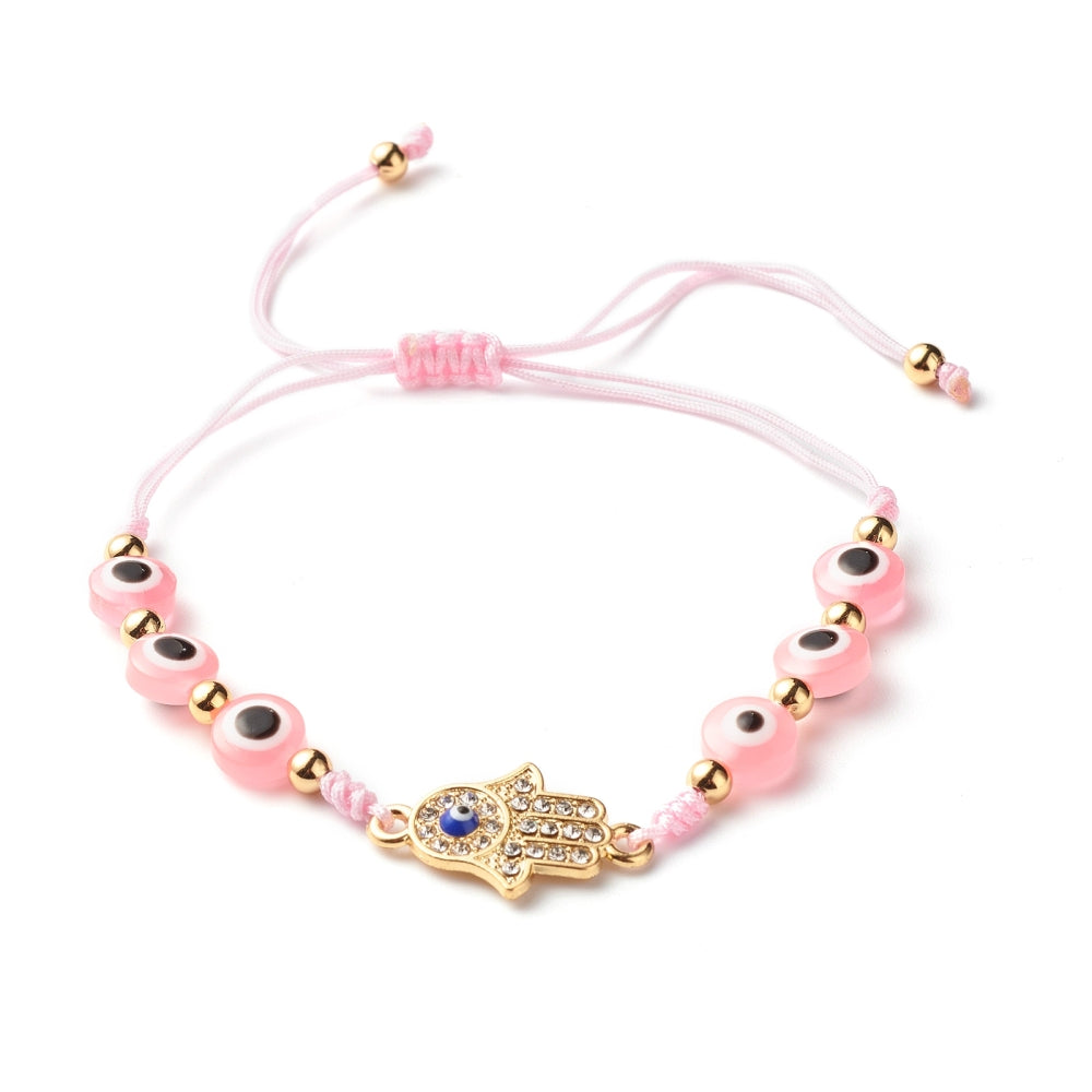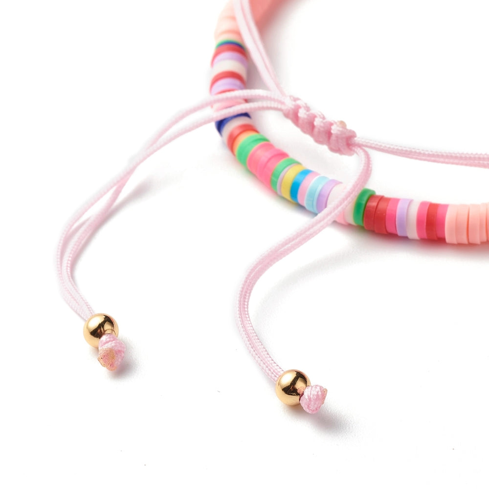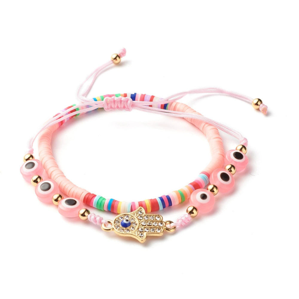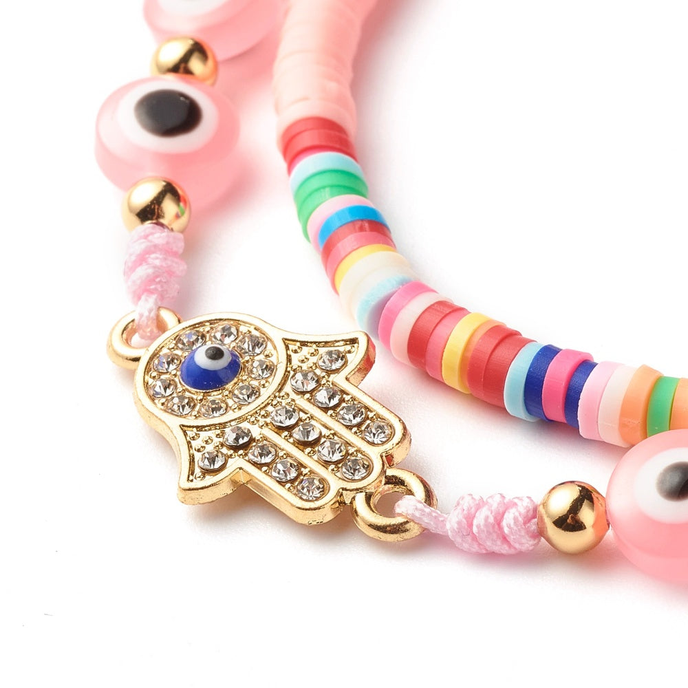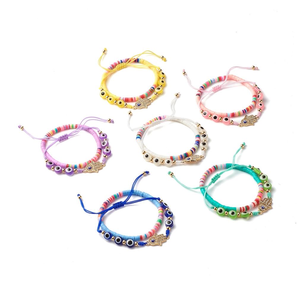 Detail - Pairs of bracelets in 5 different colours. Each pair consists of an evil eye beaded adjustable bracelet with charm, and a Heishi polymer clay stretchy bracelet.