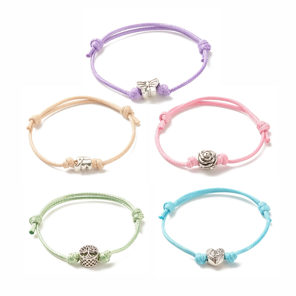5 - 50 adjustable cord friendship bracelets with heart, tree, elephant, flower, butterfly European charm beads