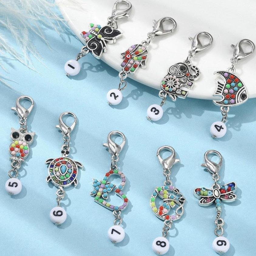 Charm type - Animal themed stitch markers / dangle charms numbered 1-9 on lobster clasps, pretty alloy multicoloured animal charms with acrylic number beads.