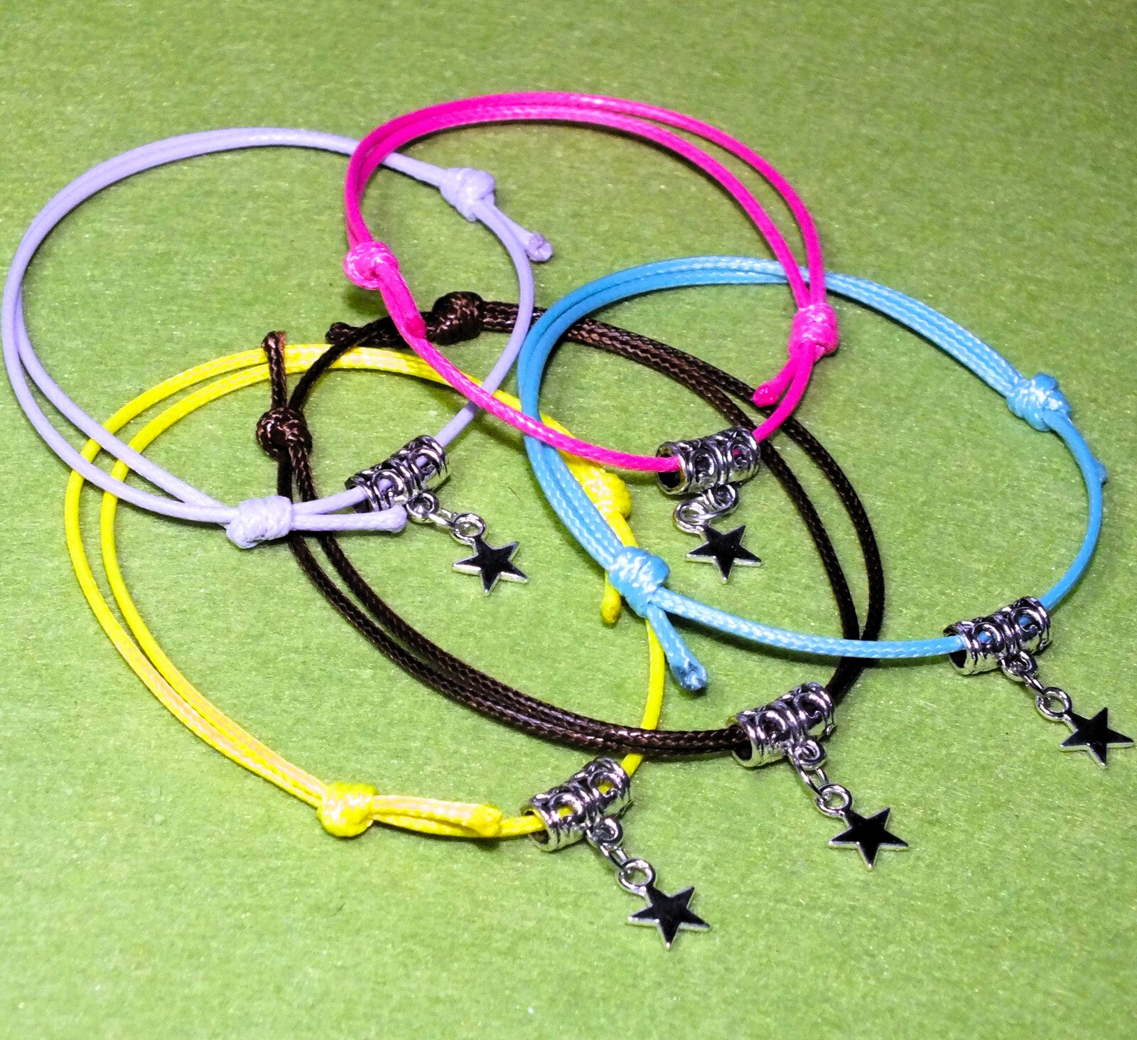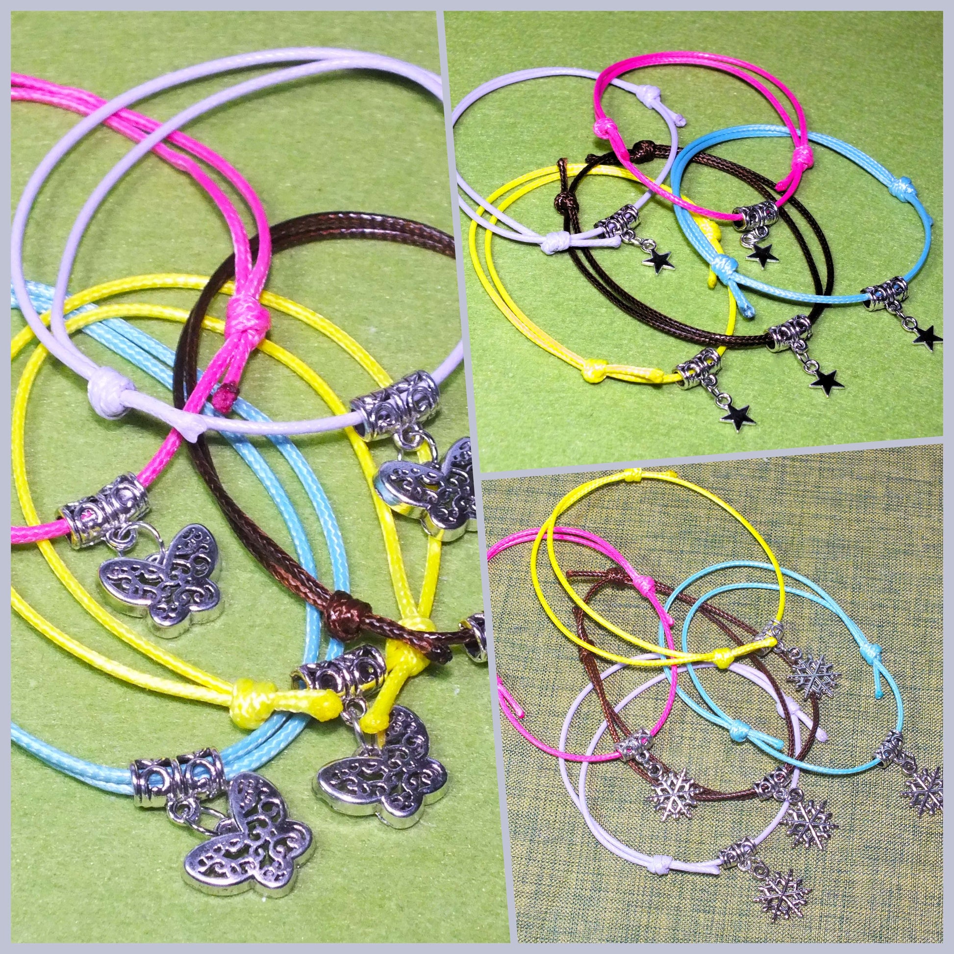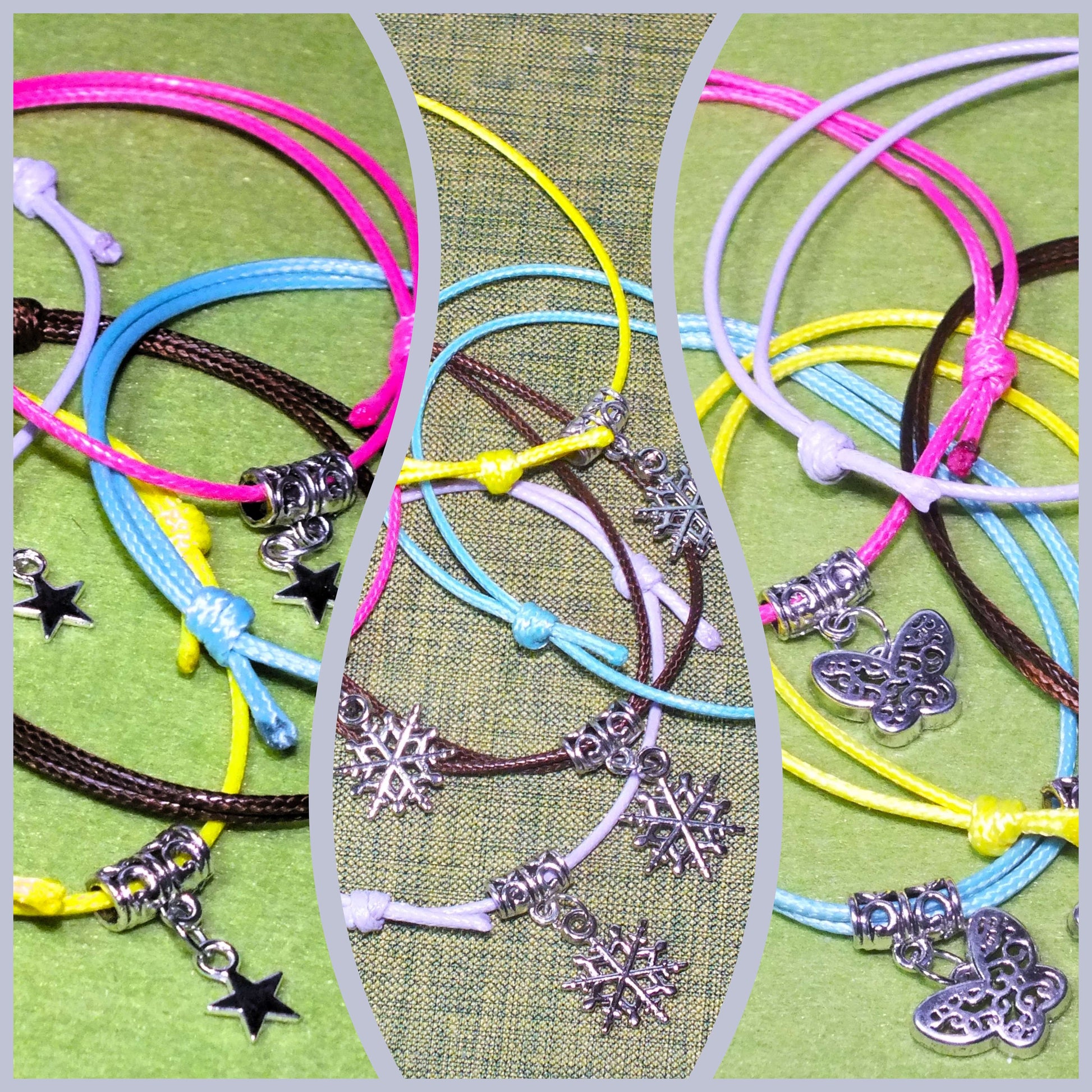 - Detail - Pretty multi-coloured adjustable waxed polyester bracelets with your choice of charm - snowflake, star, butterfly, or a mixture.