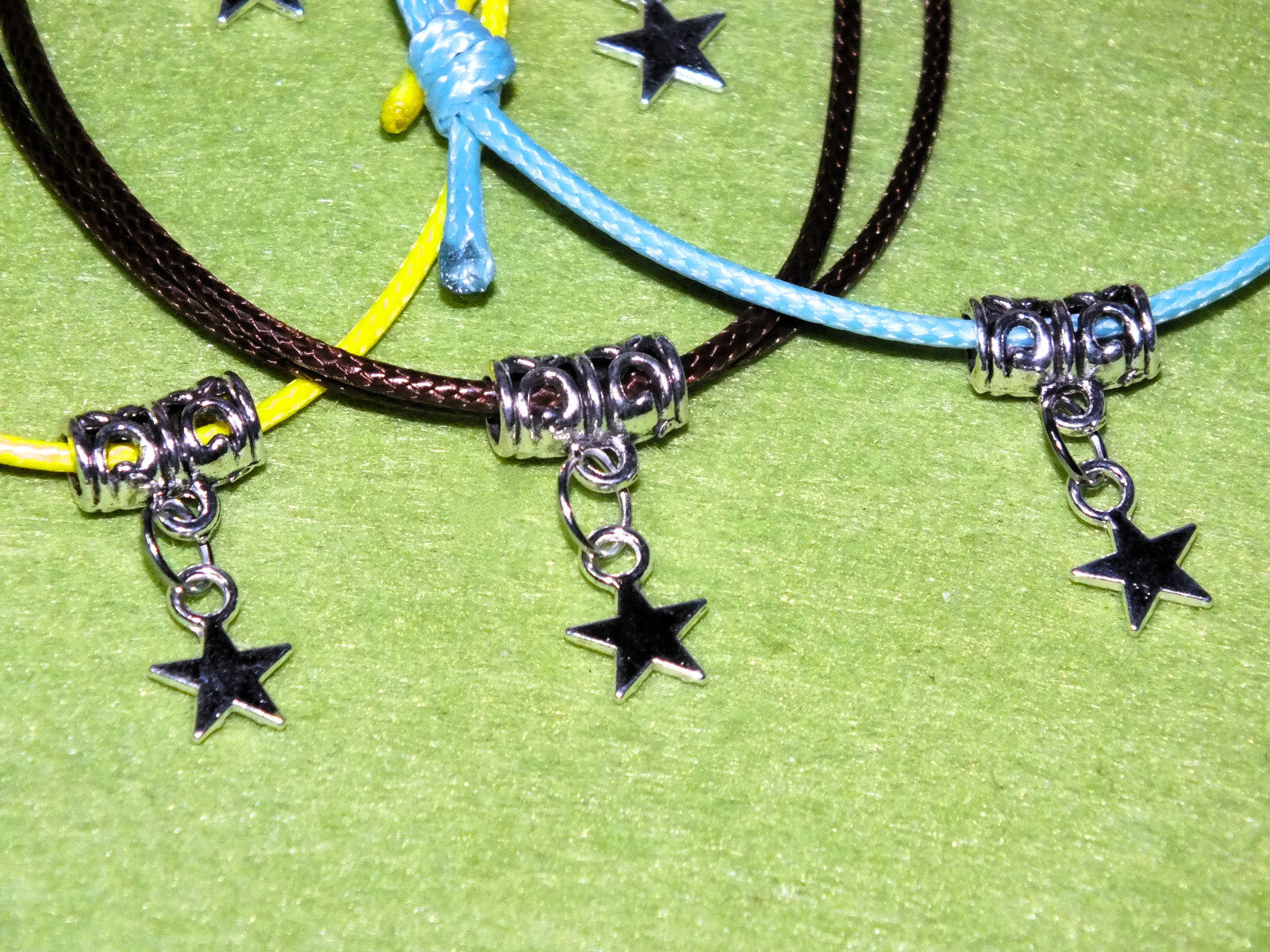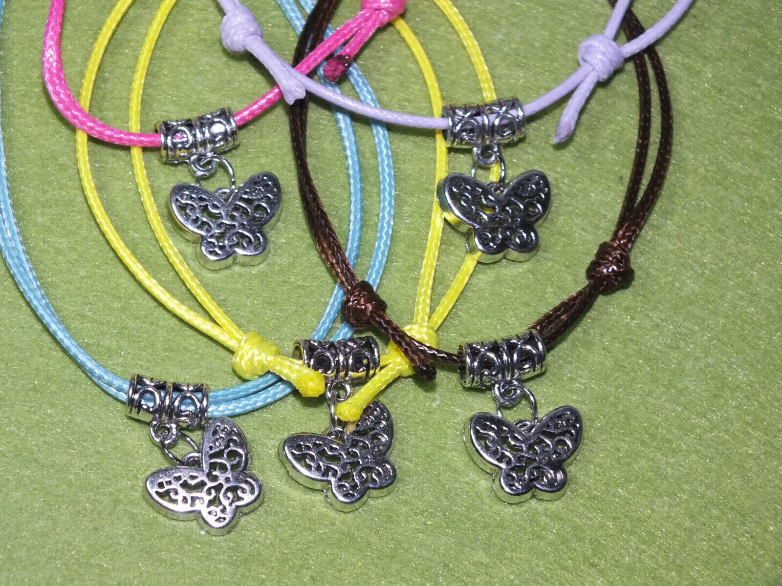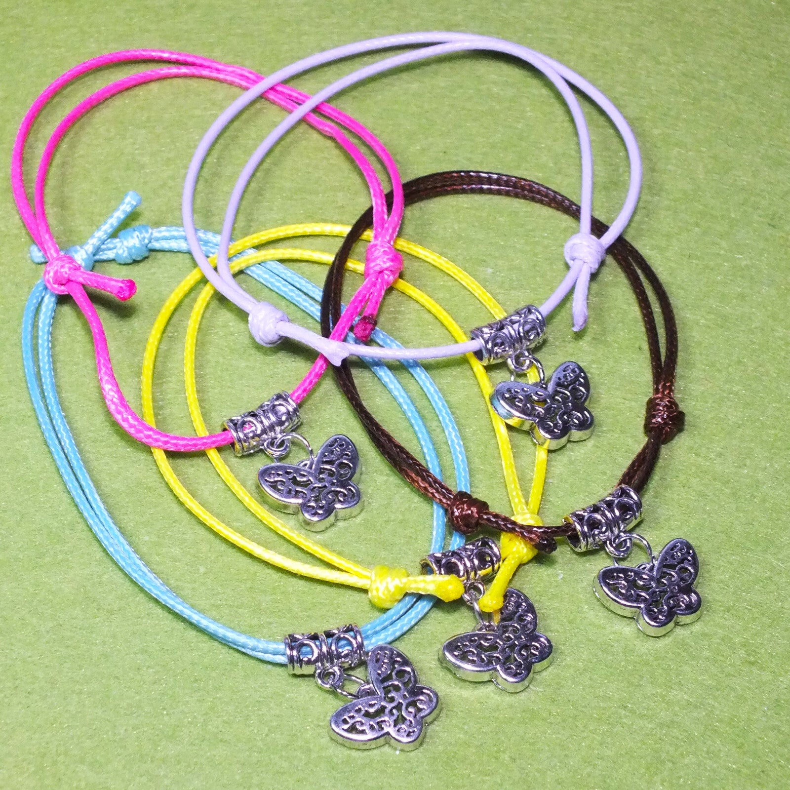 - Detail - Pretty multi-coloured adjustable waxed polyester bracelets with your choice of charm - snowflake, star, butterfly, or a mixture.