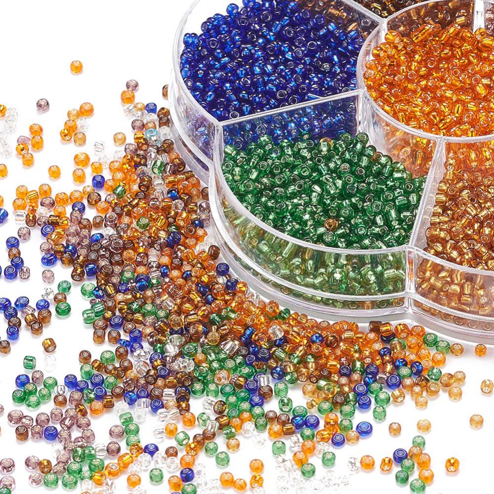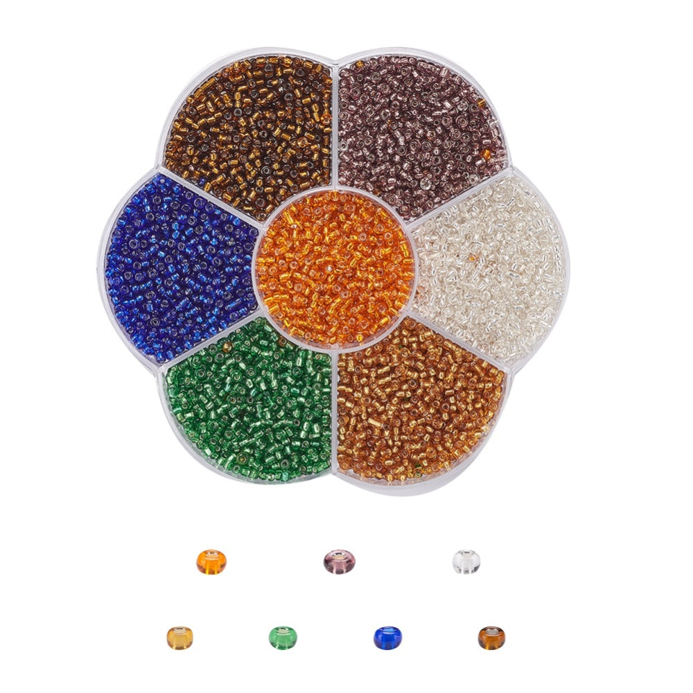 7 compartments of glass seed beads, approx. 650pcs per colour. Seeds are 2mm in diameter with a hole approx. 1mm. Total about 4550pcs/box.