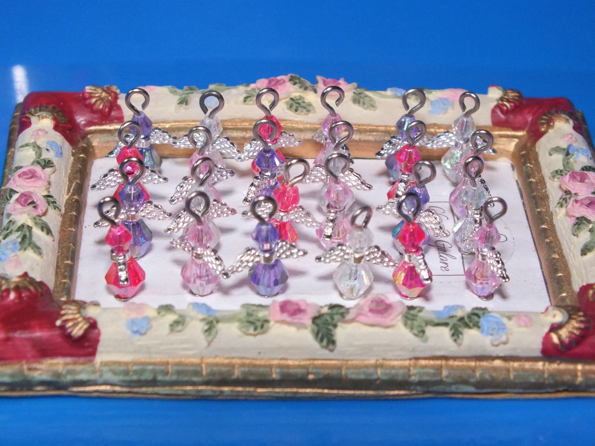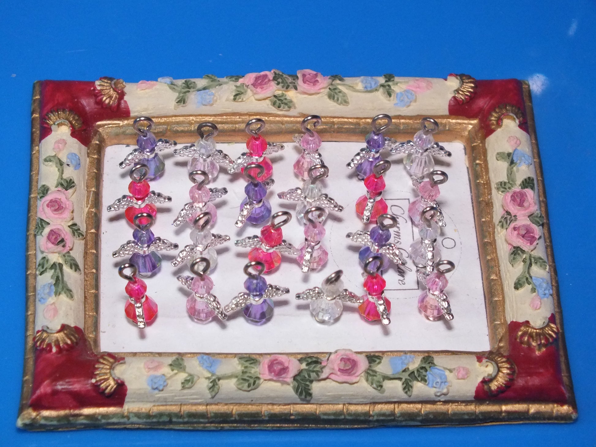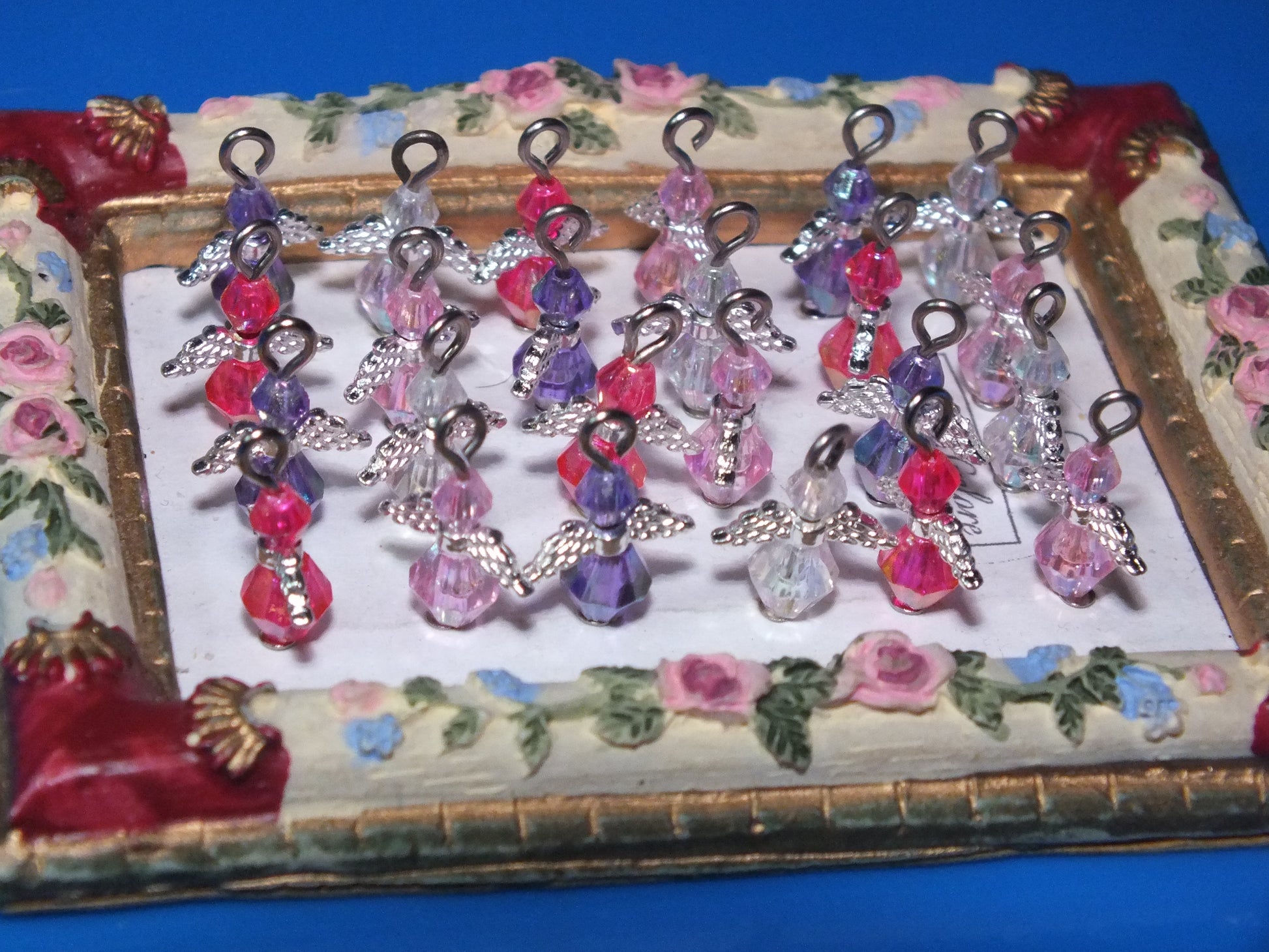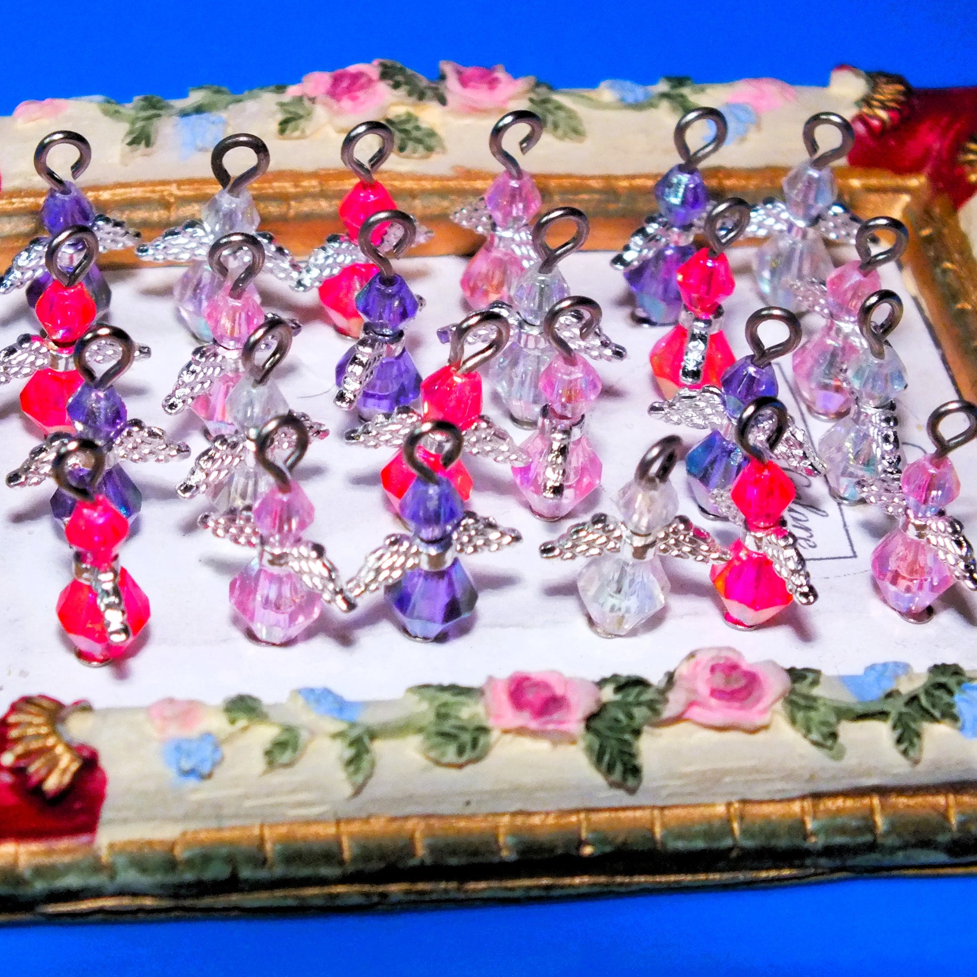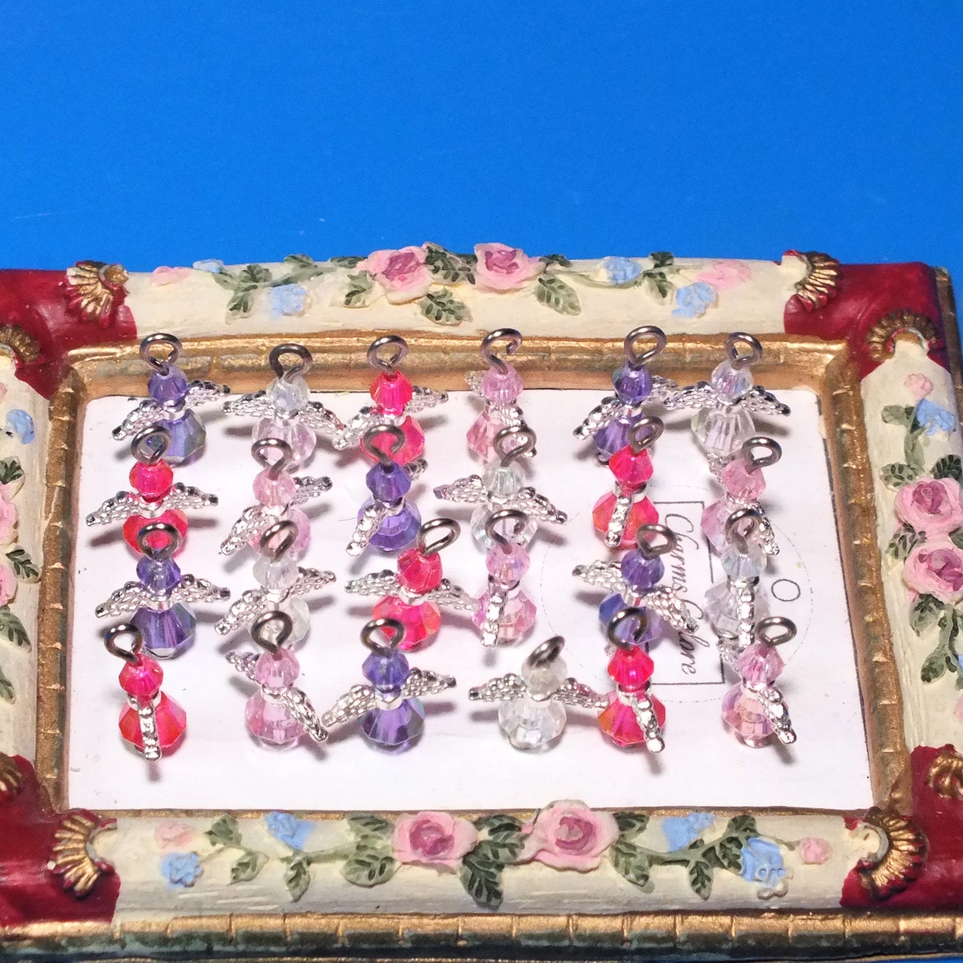 Charm type - Handmade angel charms, a mixture of purple / dark pink / pink / clear with an AB finish. Acrylic with silver tone findings. Size is approx. 16mm x 12mm.