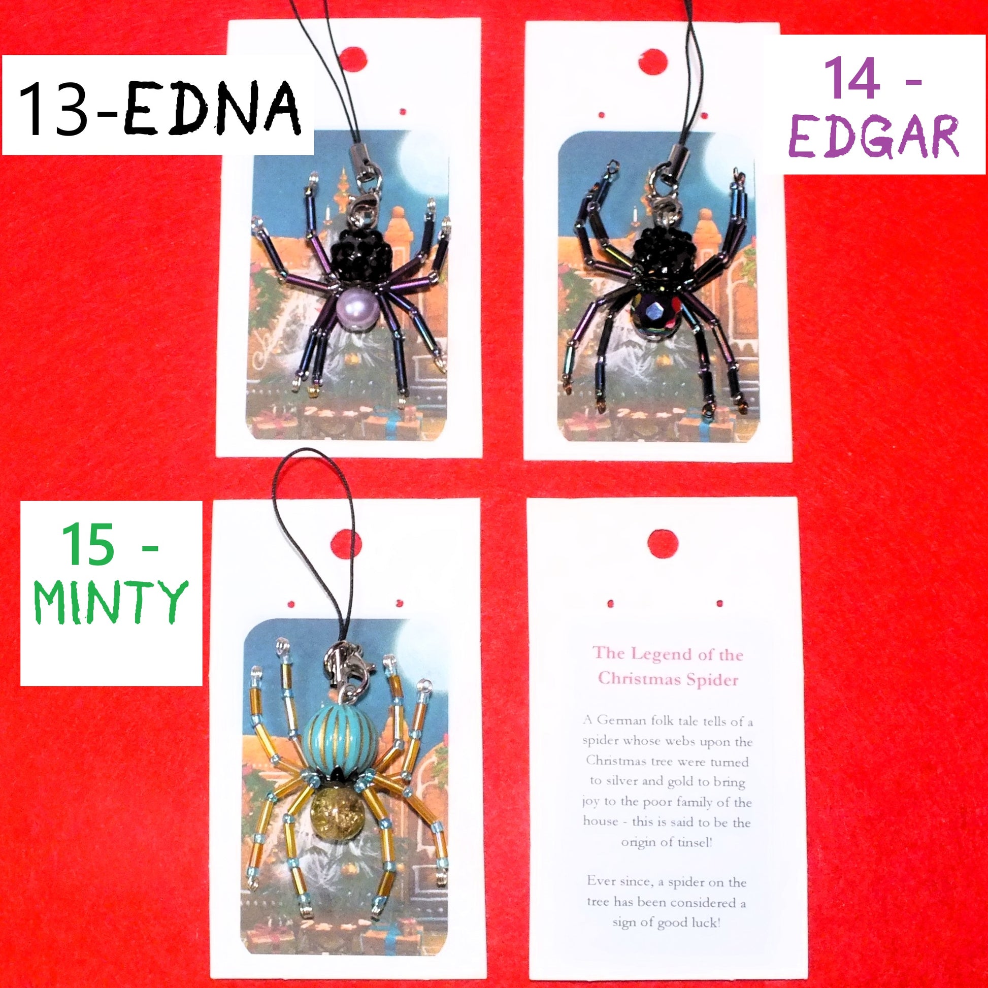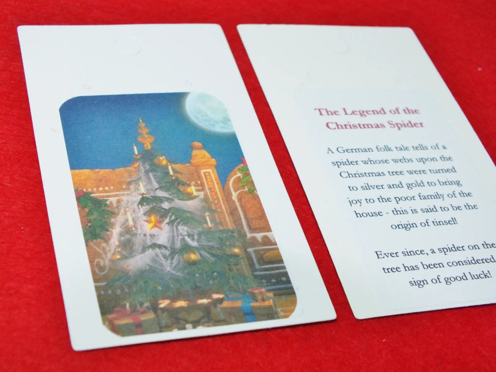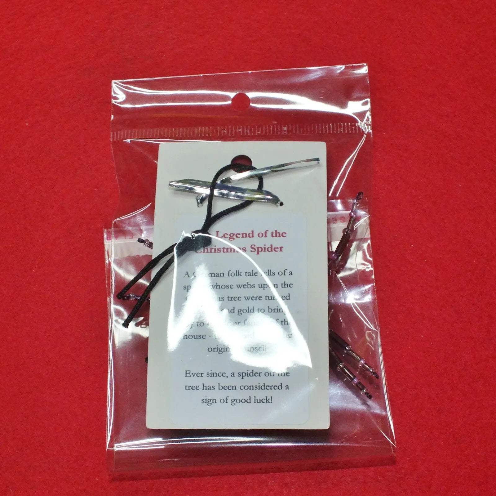 Each spider comes on a doublesided card which contains an original piece of art created by myself especially for the spiders, and a telling of the legend of the Christmas Spider, a German folk tale about the origin of tinsel. This is presented inside a cellophane packet for convenient gifting or storage.