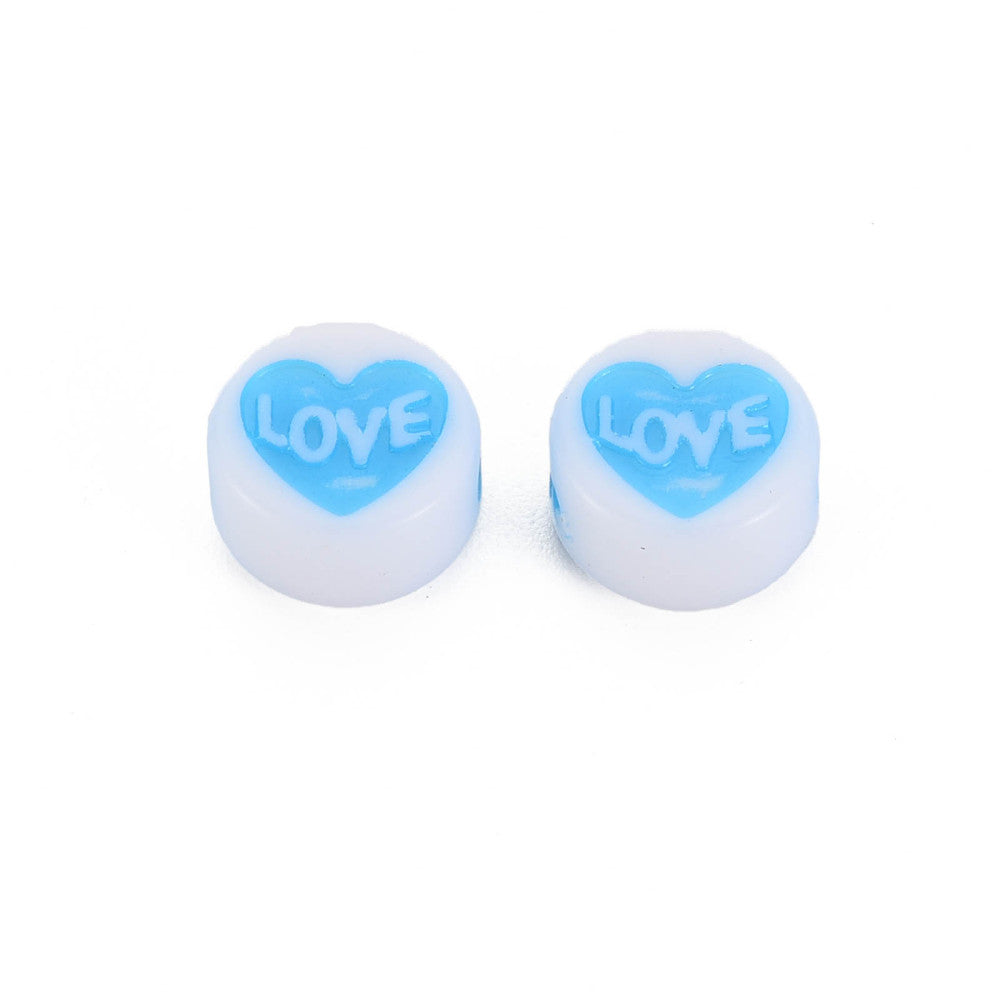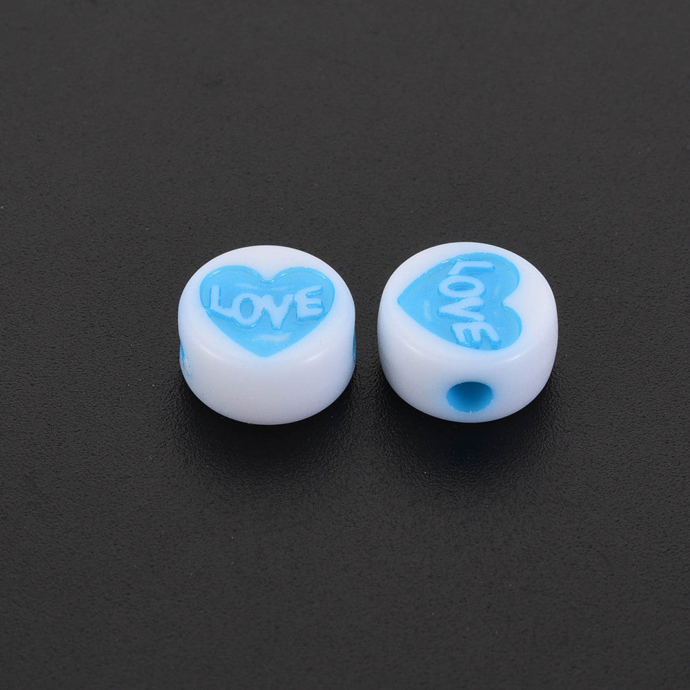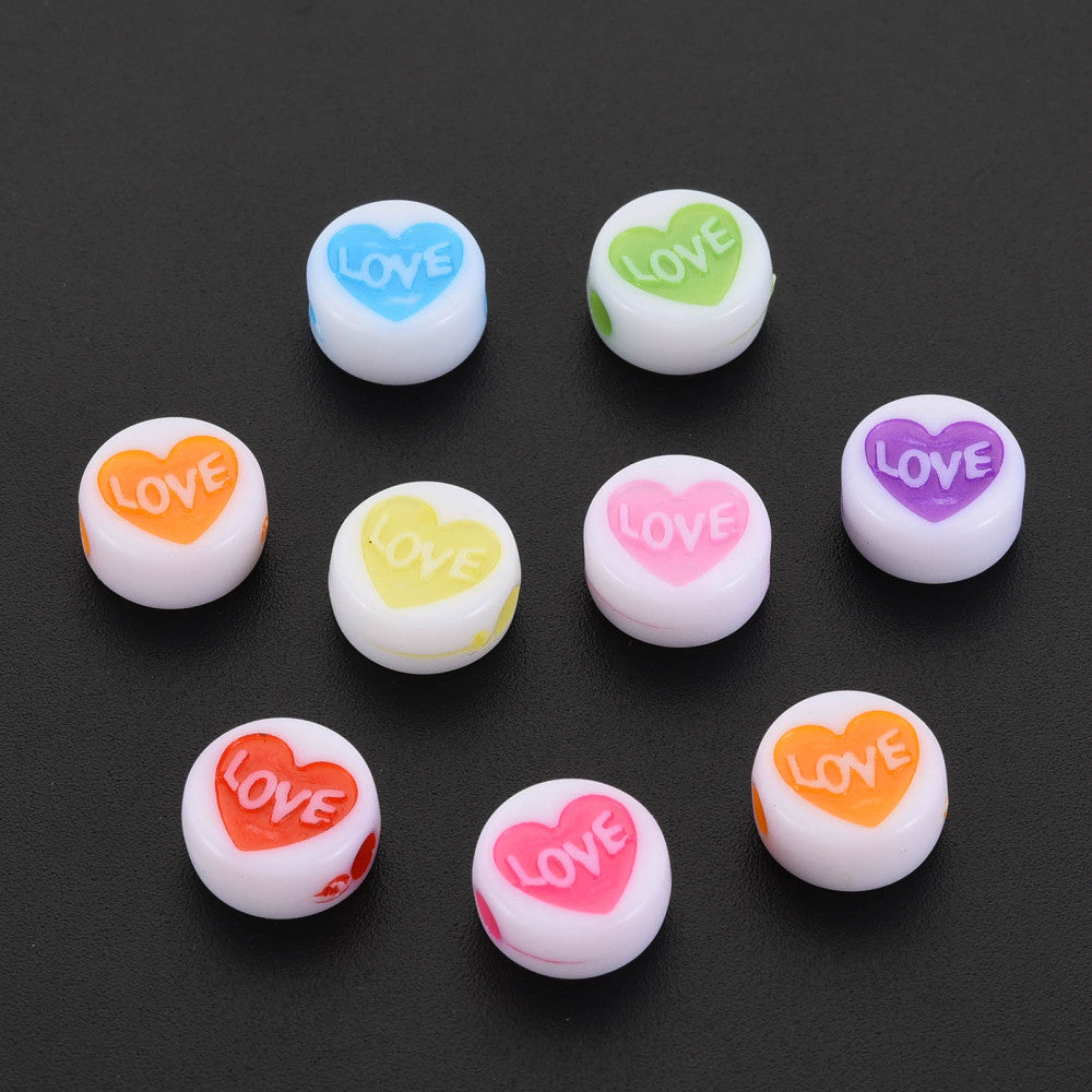 Bead type - Flat round acrylic coin bead with heart the word "Love", mixed colour,