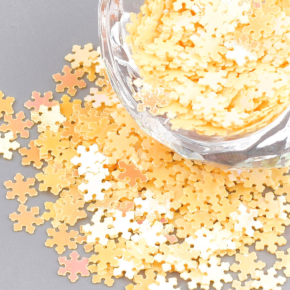 Sequin / paillette detail: Golden yellow PVC toppers / embellishments, snowflake shaped, with an AB finish.
