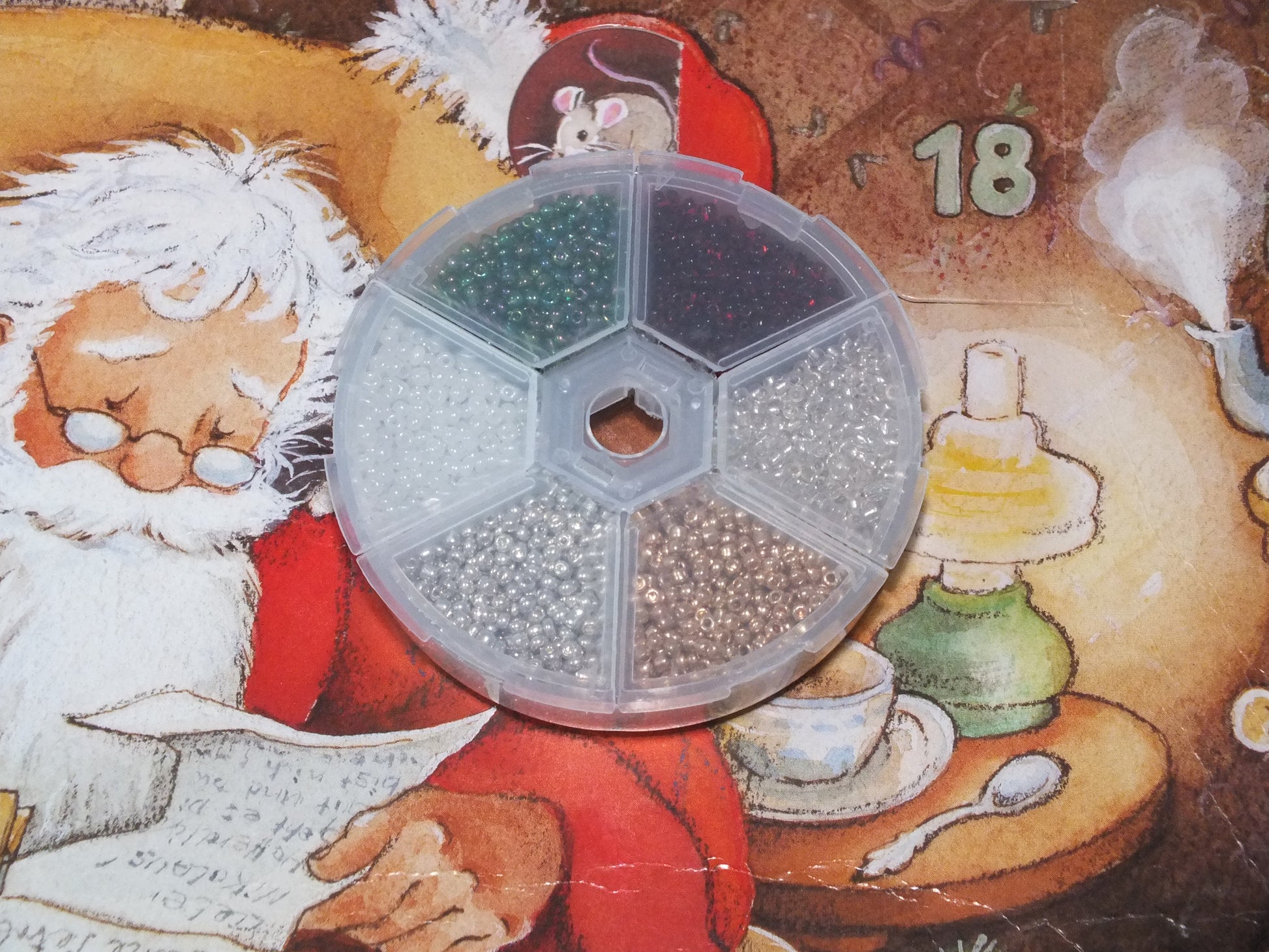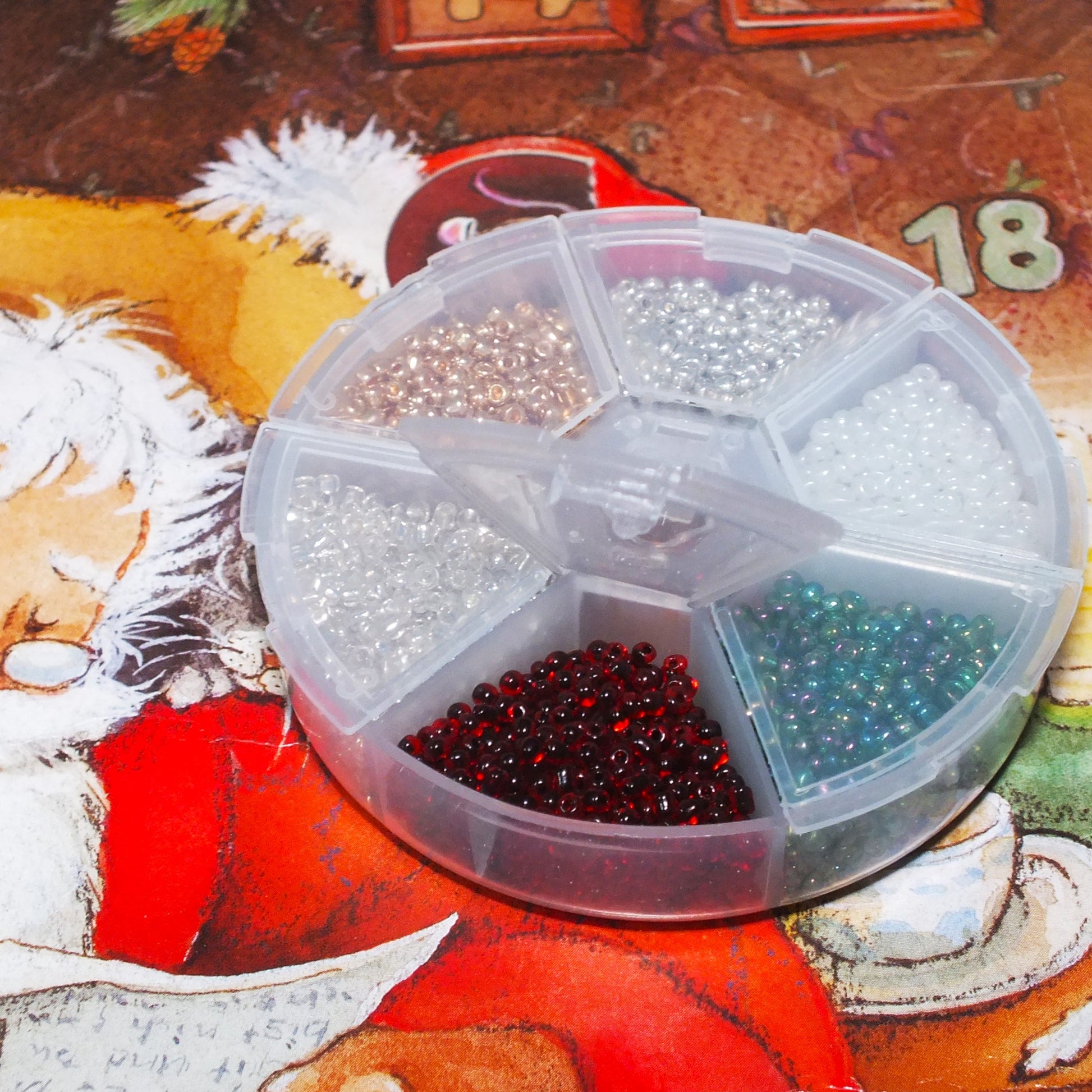 Festive 2mm seed bead selection box - berry red, snow white, green, clear, silver, gold