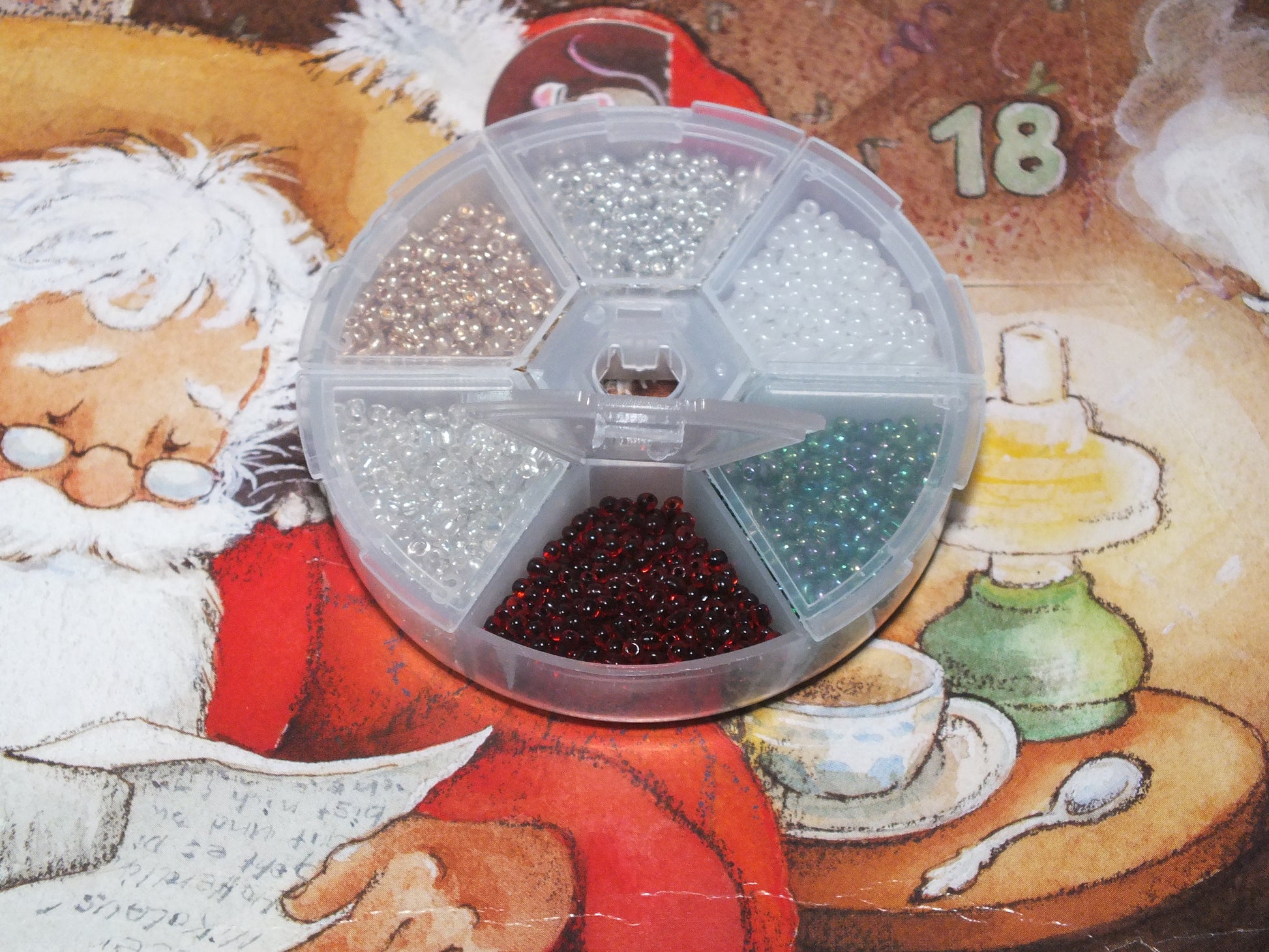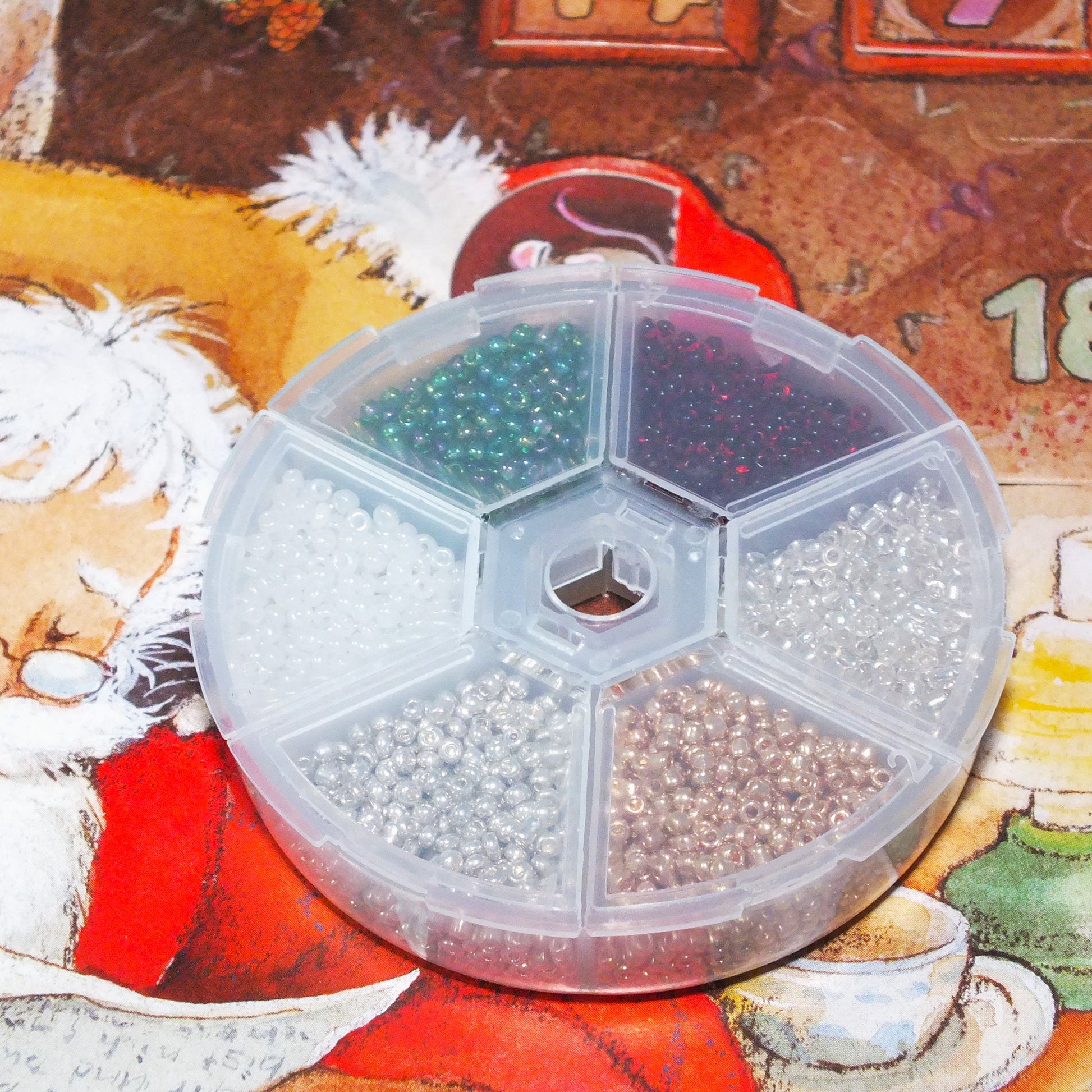- 6 compartments of glass seed beads, approx. 9g weight per compartment. Seeds are 2mm in diameter with a hole approx. 1mm.