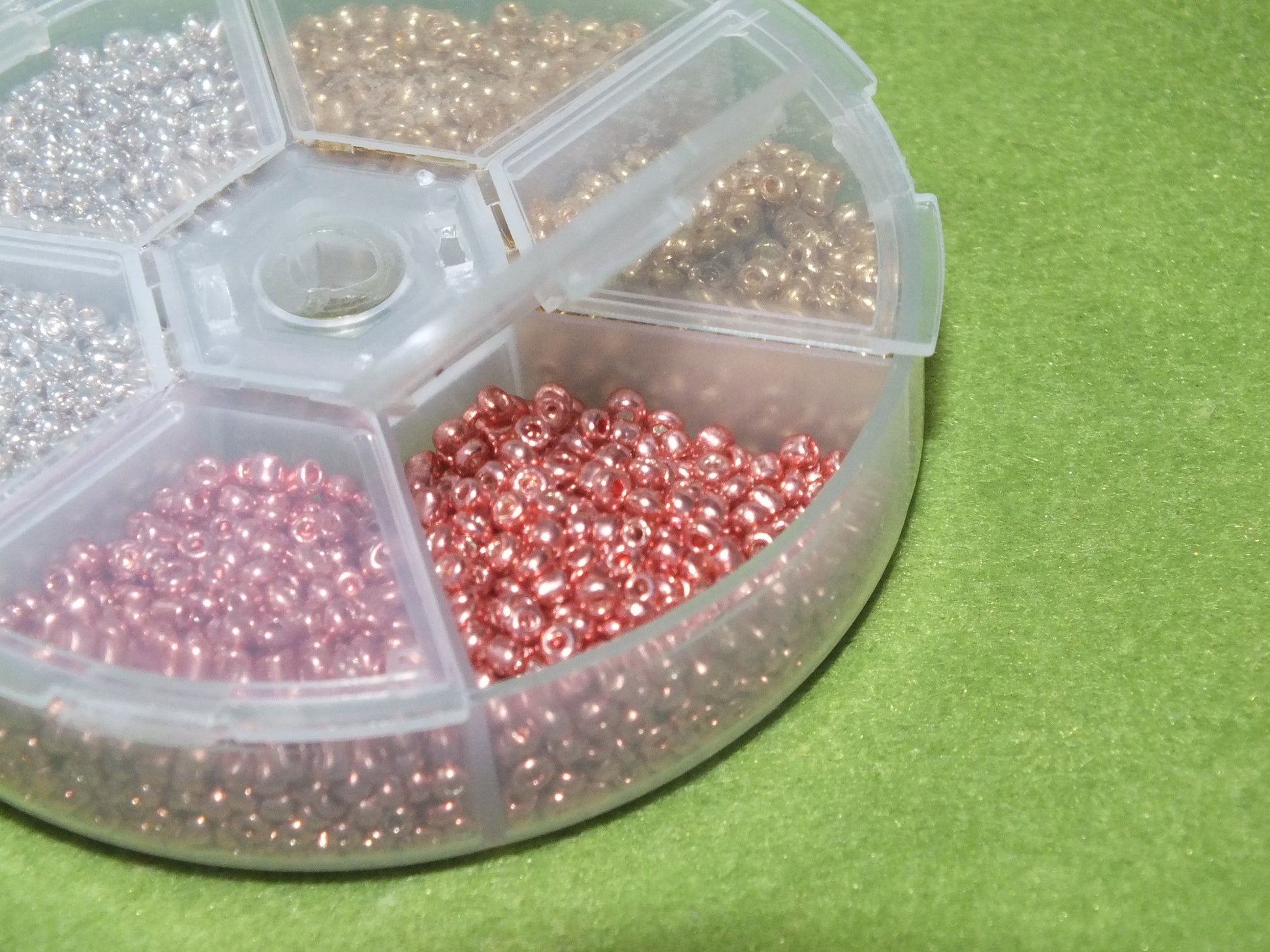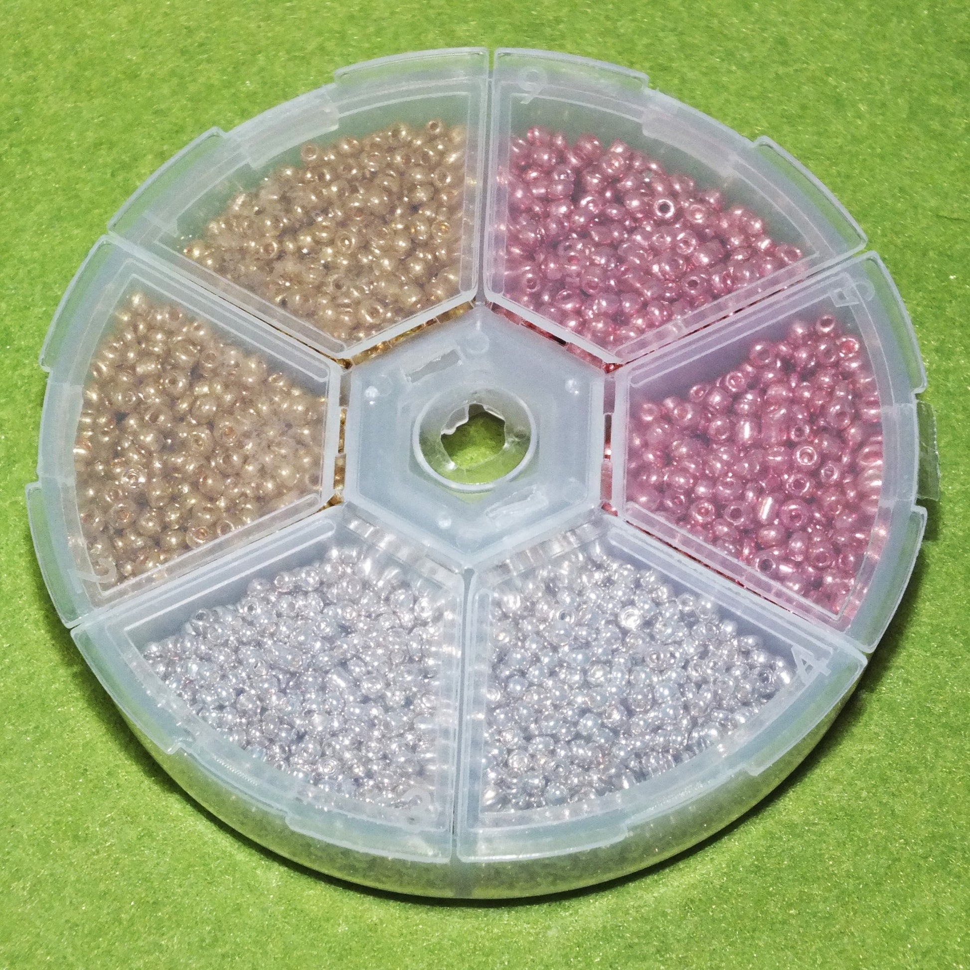 - 6 compartments of glass seed beads, approx. 9g weight per compartment. Seeds are 2mm in diameter with a hole approx. 1mm.