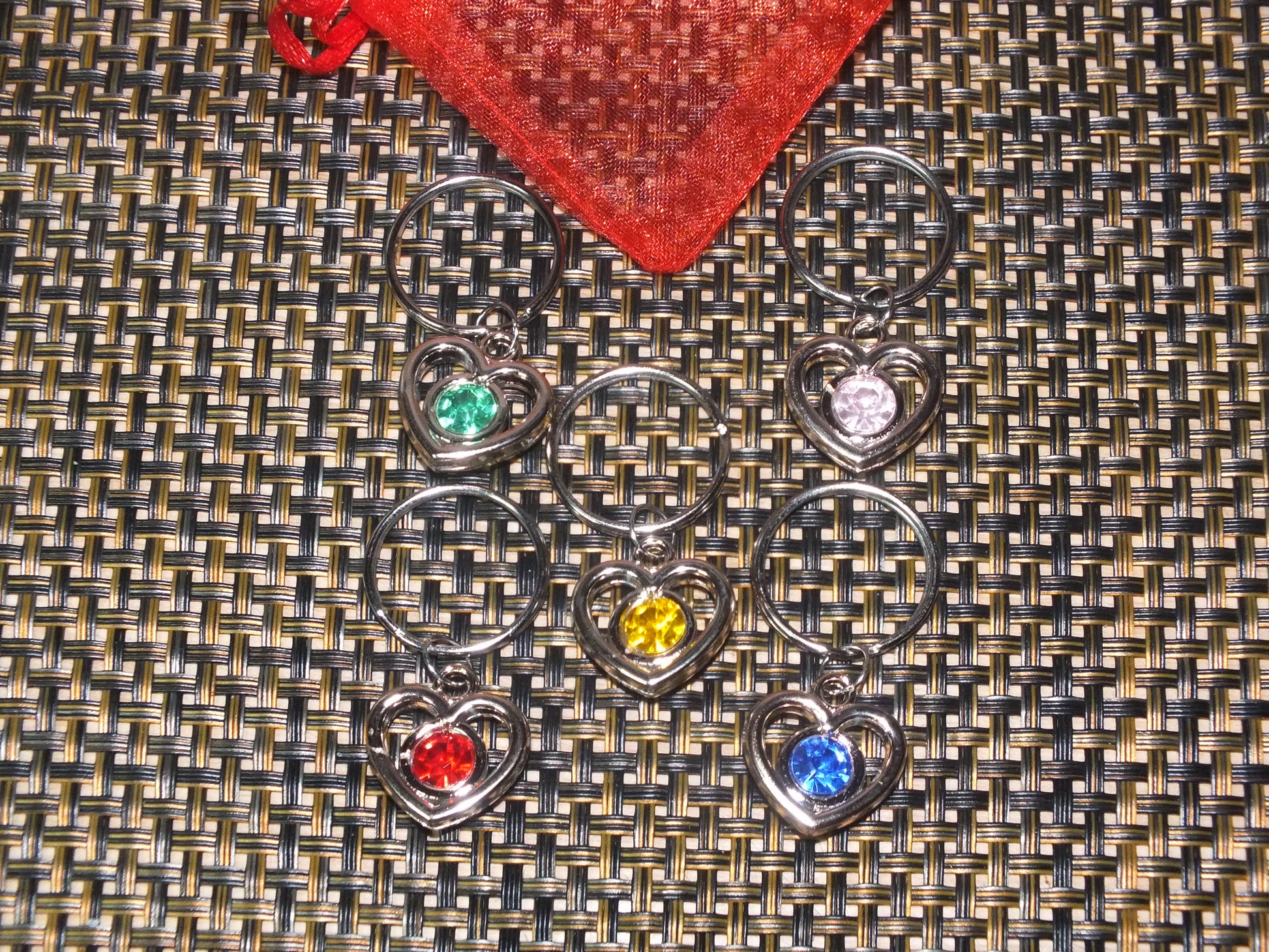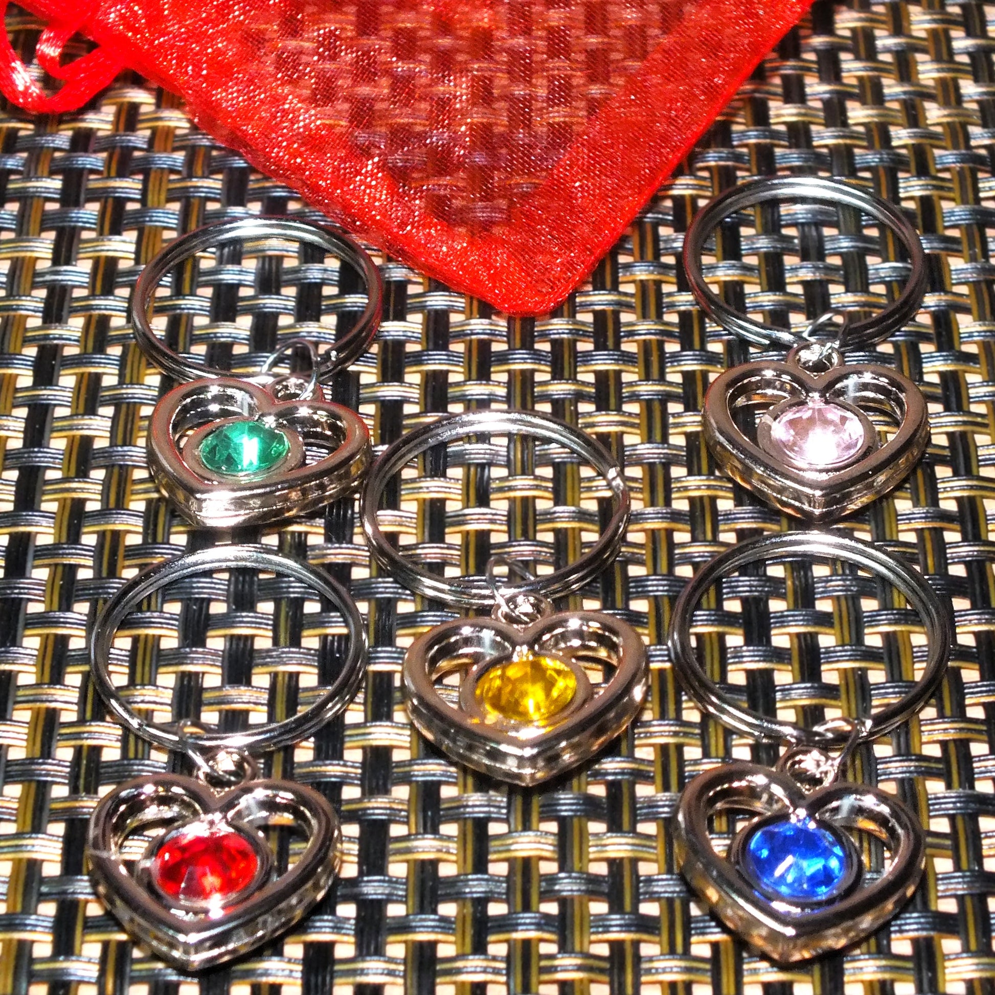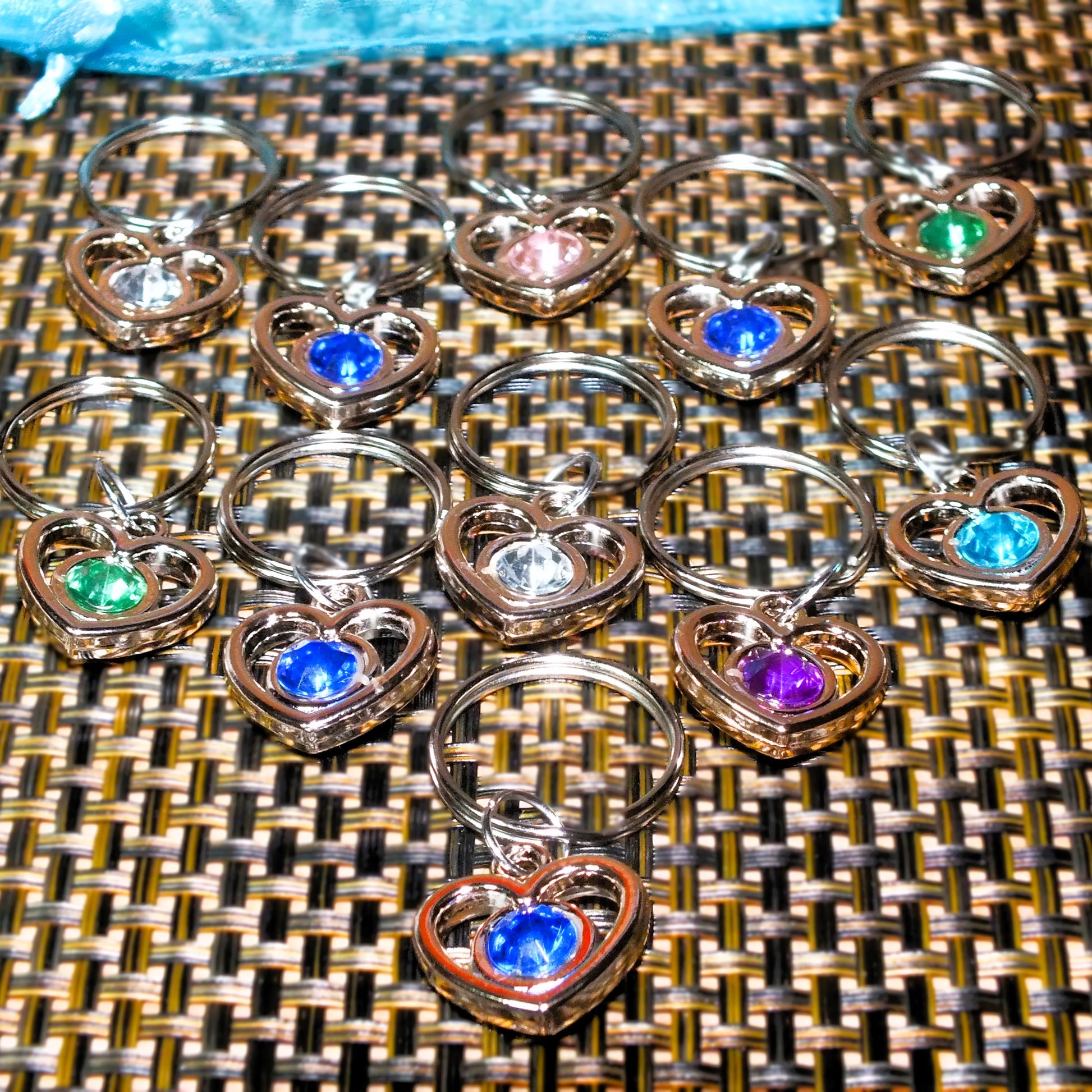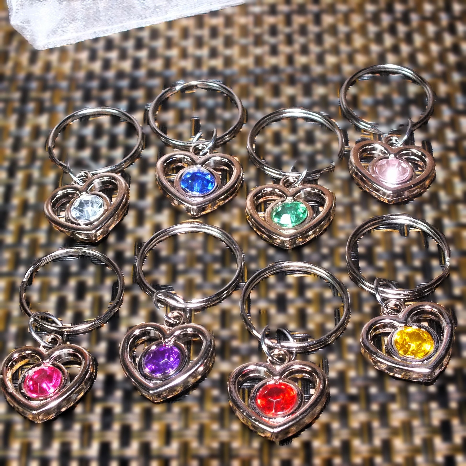 - Handmade keyrings featuring a silver tone metal split ring with an acrylic heart charm. These have an acrylic rhinestone centrepiece in various colours.
