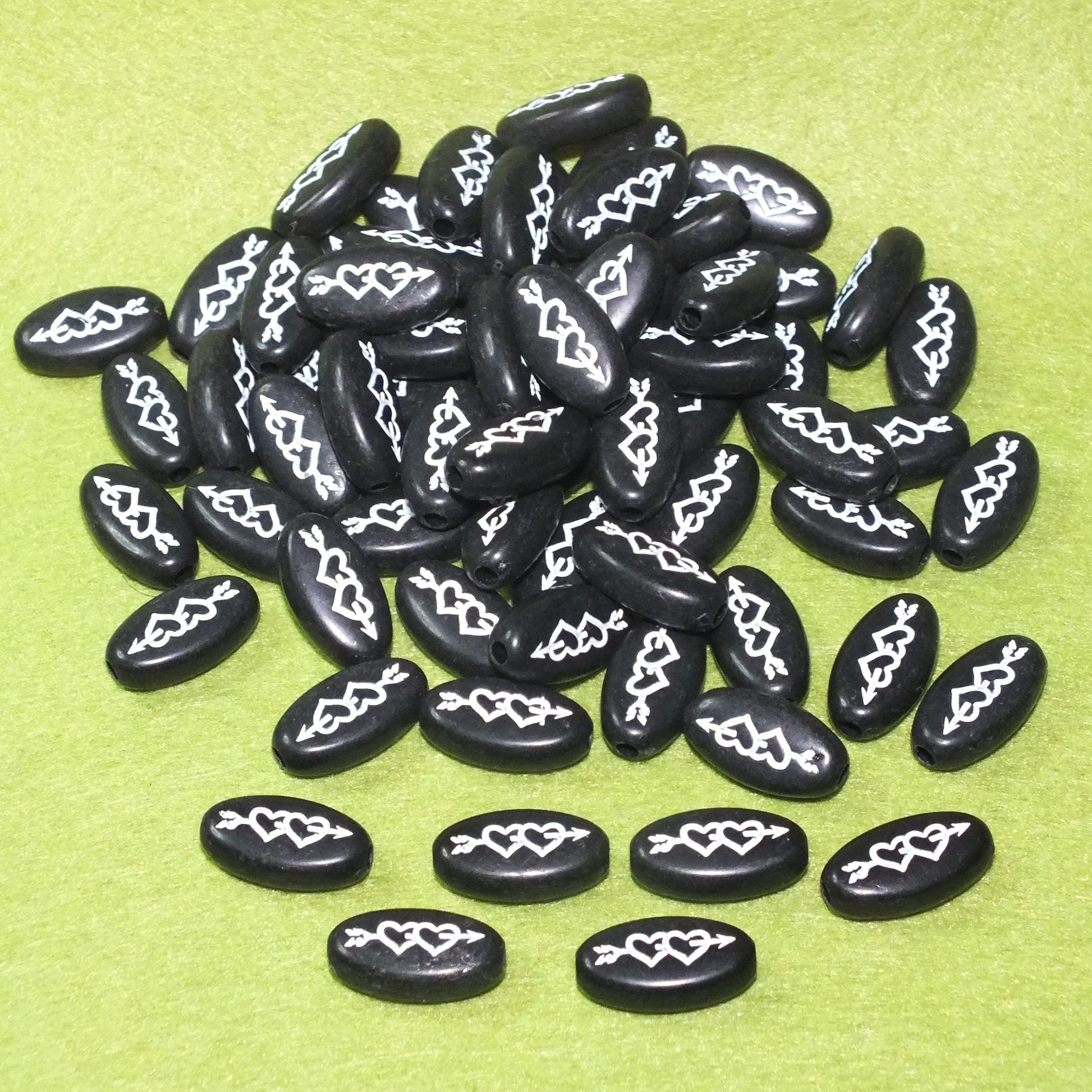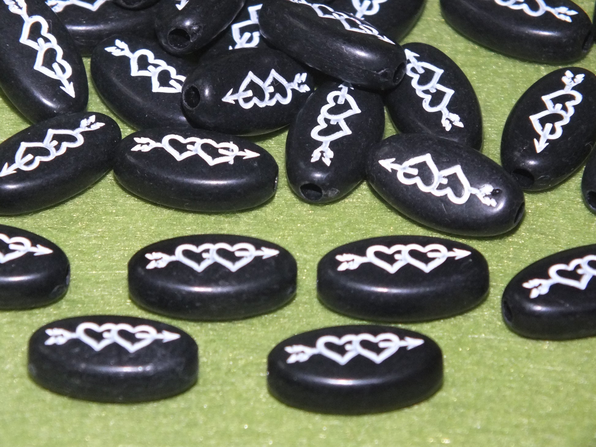 Bead type - Opaque black acrylic oval bead with white hearts & arrow, doublesided.