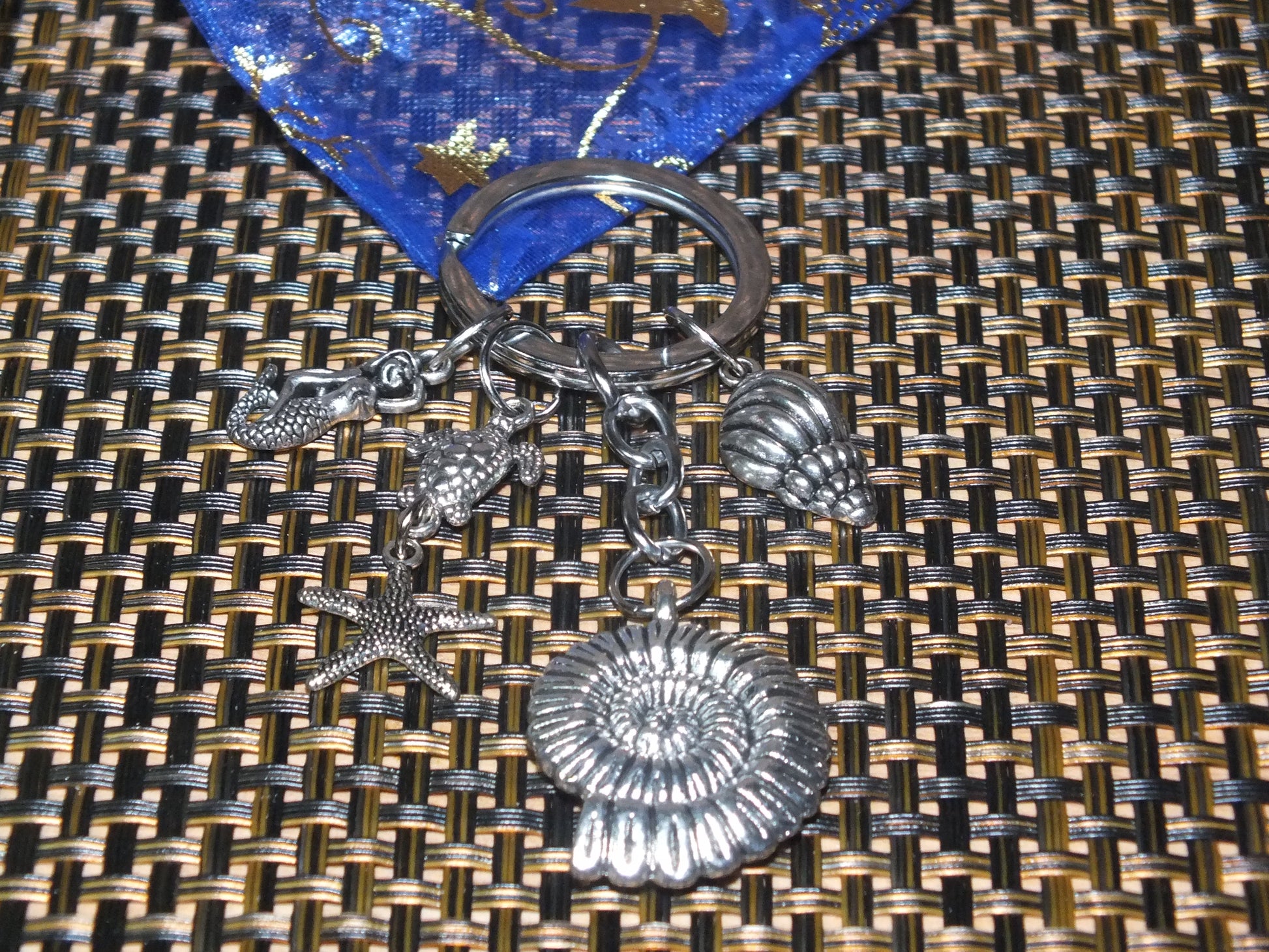 - A handmade keyring, silver tone with attractive charms as shown. The main shell charm is large and heavy!