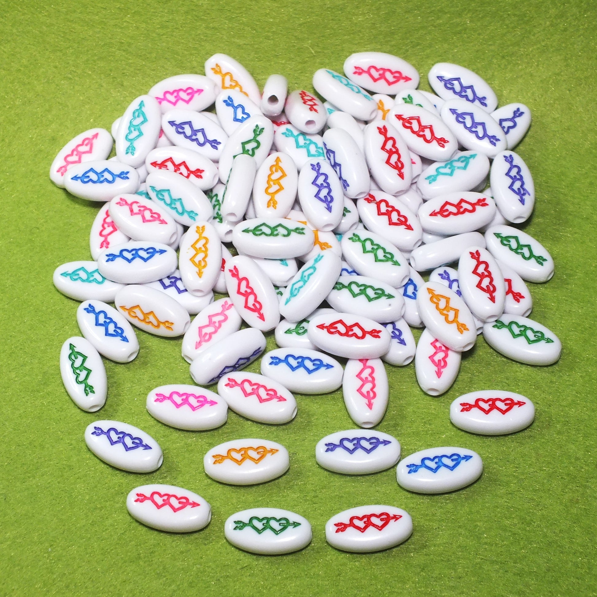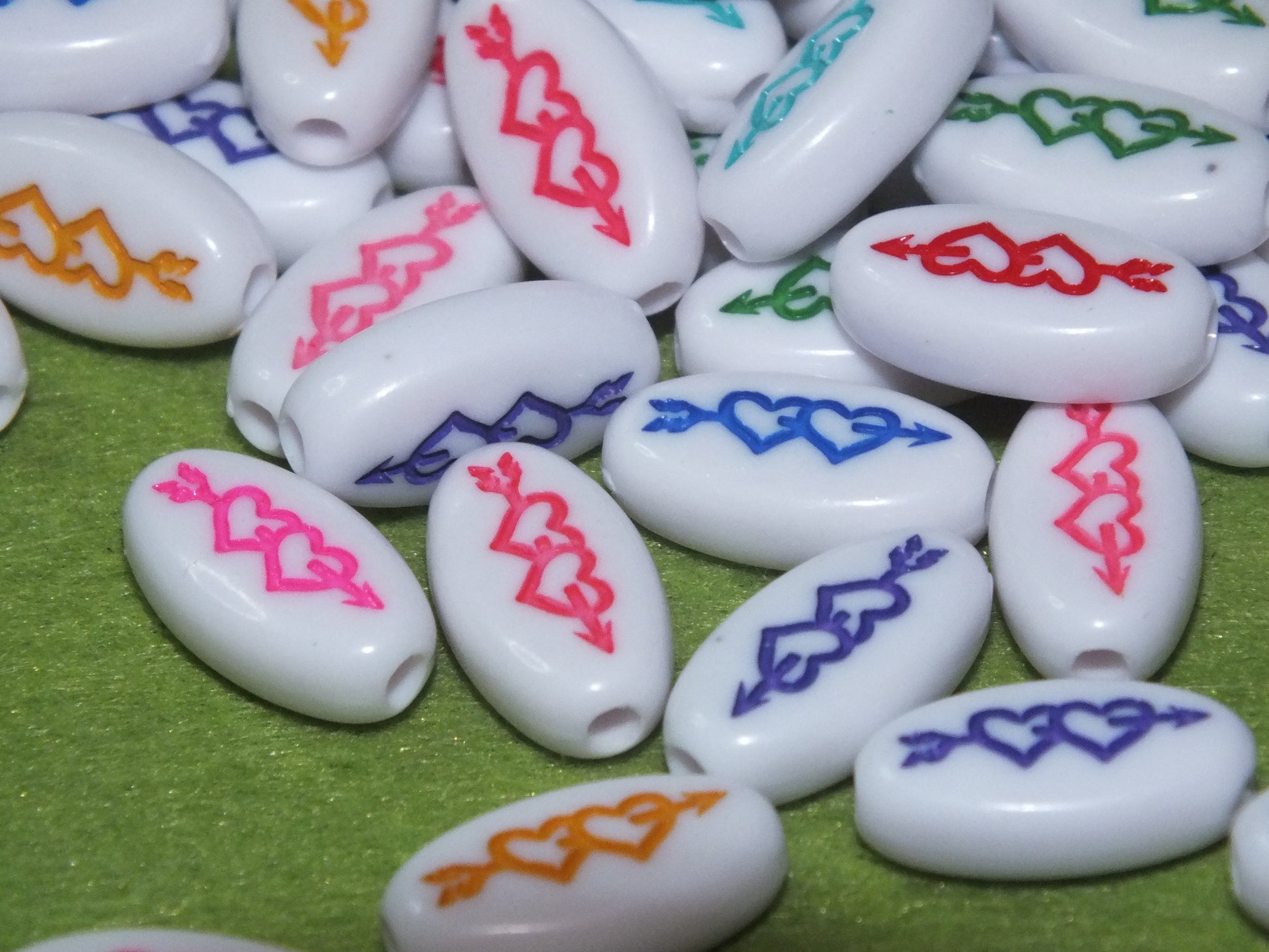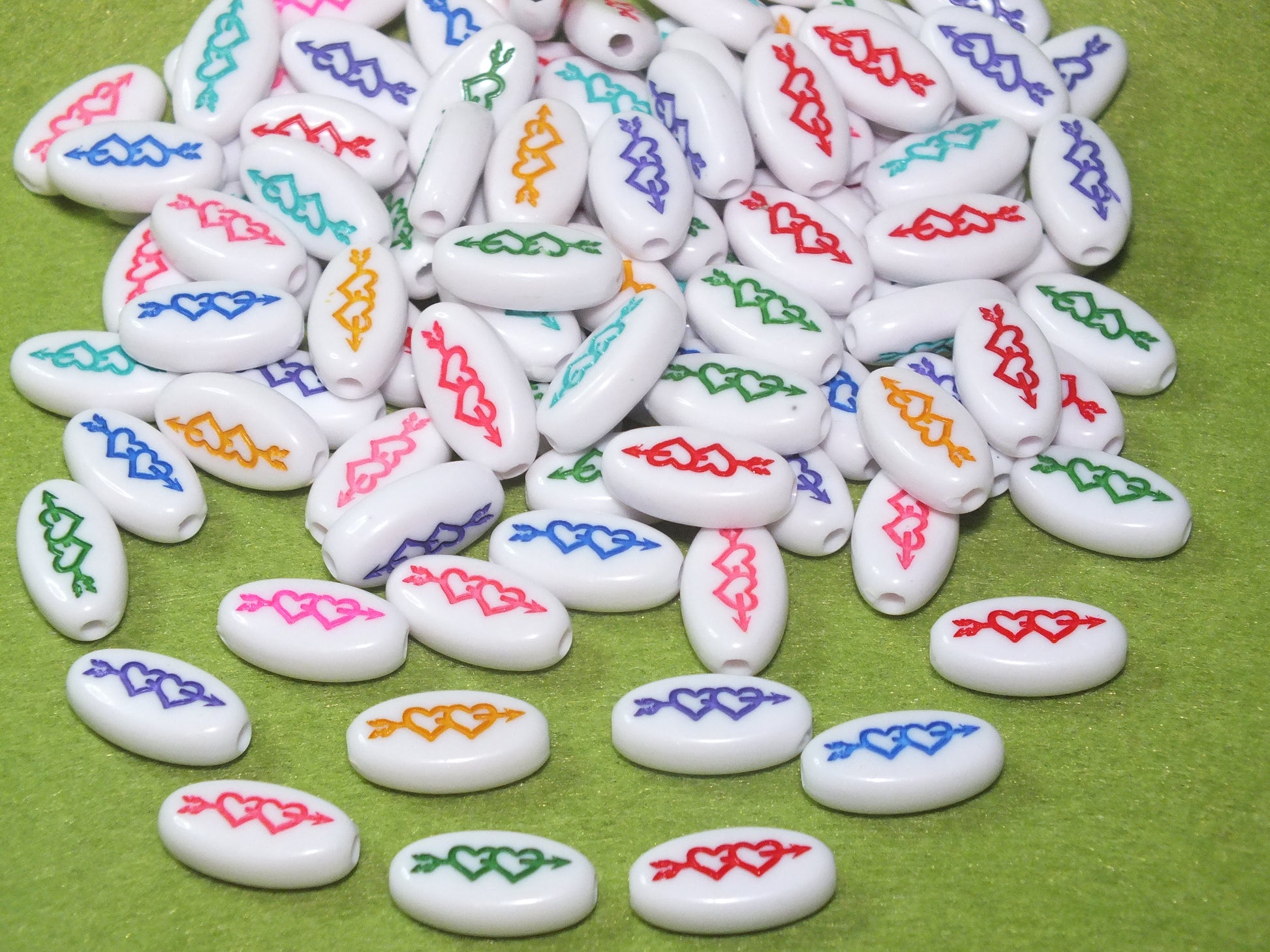 Bead type - Opaque white acrylic oval bead with assorted coloured hearts & arrow, doublesided.