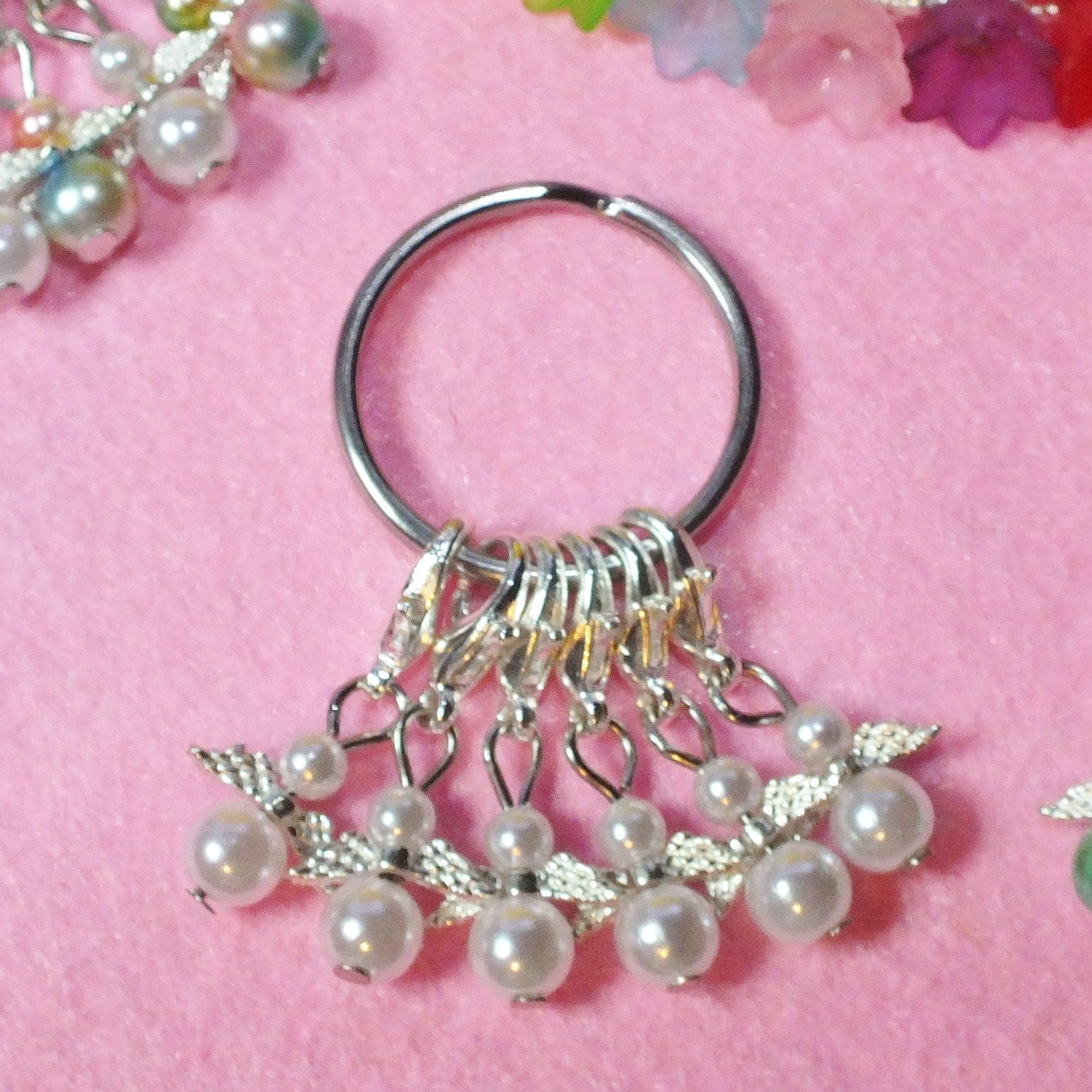 6 White angel stitch markers, handmade, on clasps with keyring.