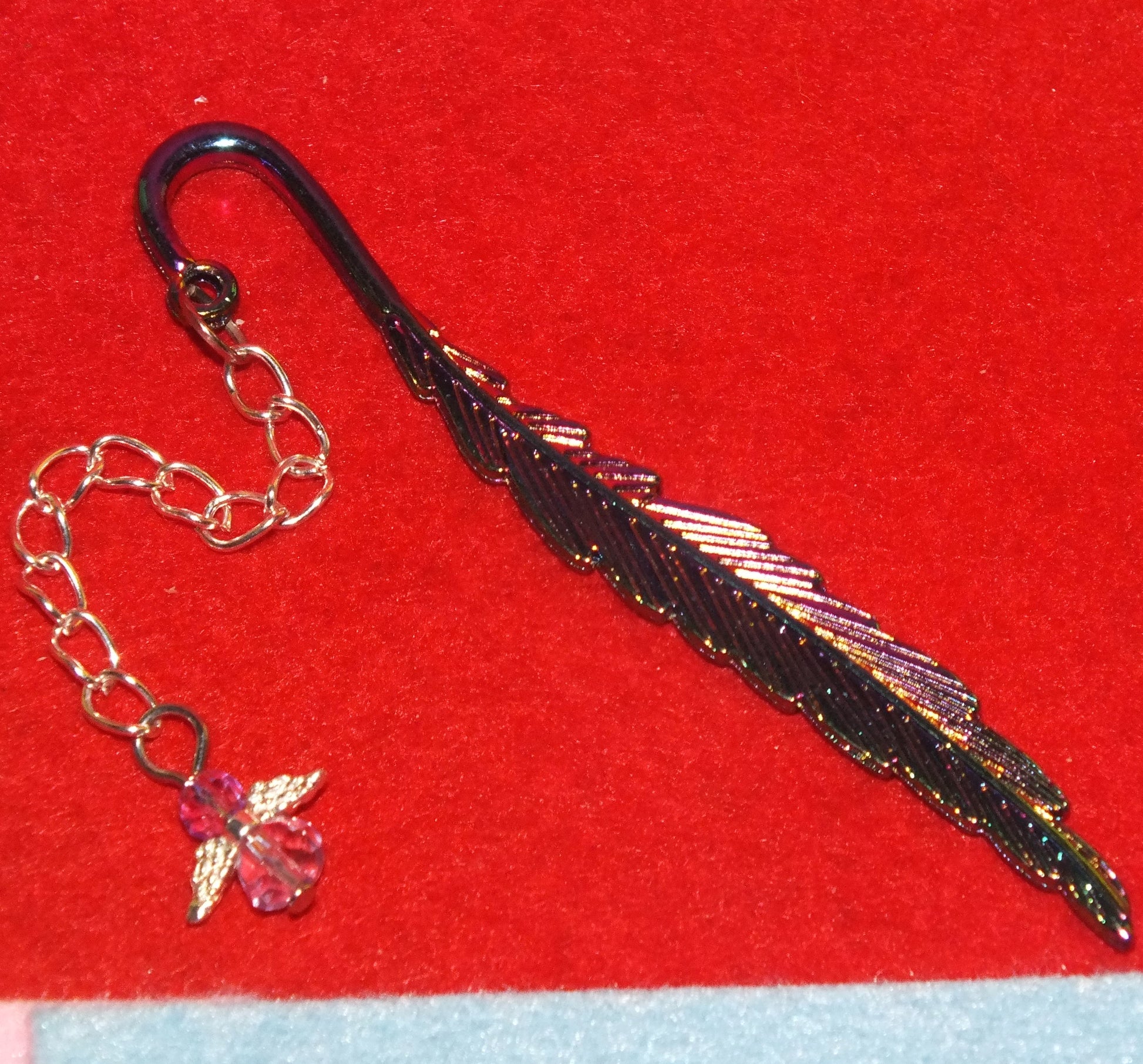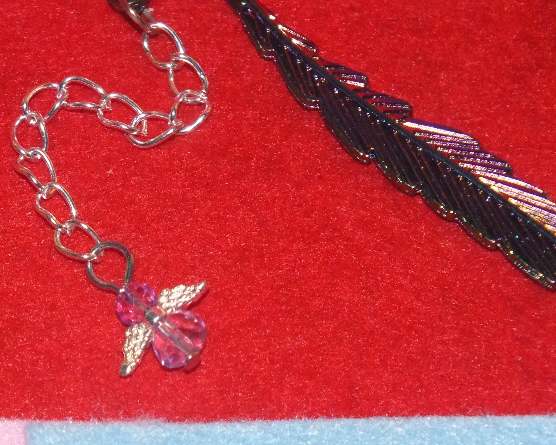 A pretty handmade guardian angel bookmark with feather design. The bookmark itself is 8cm in length, in electroplated silver tone metal, with an angel of soft lilac faceted glass with silver tone findings.