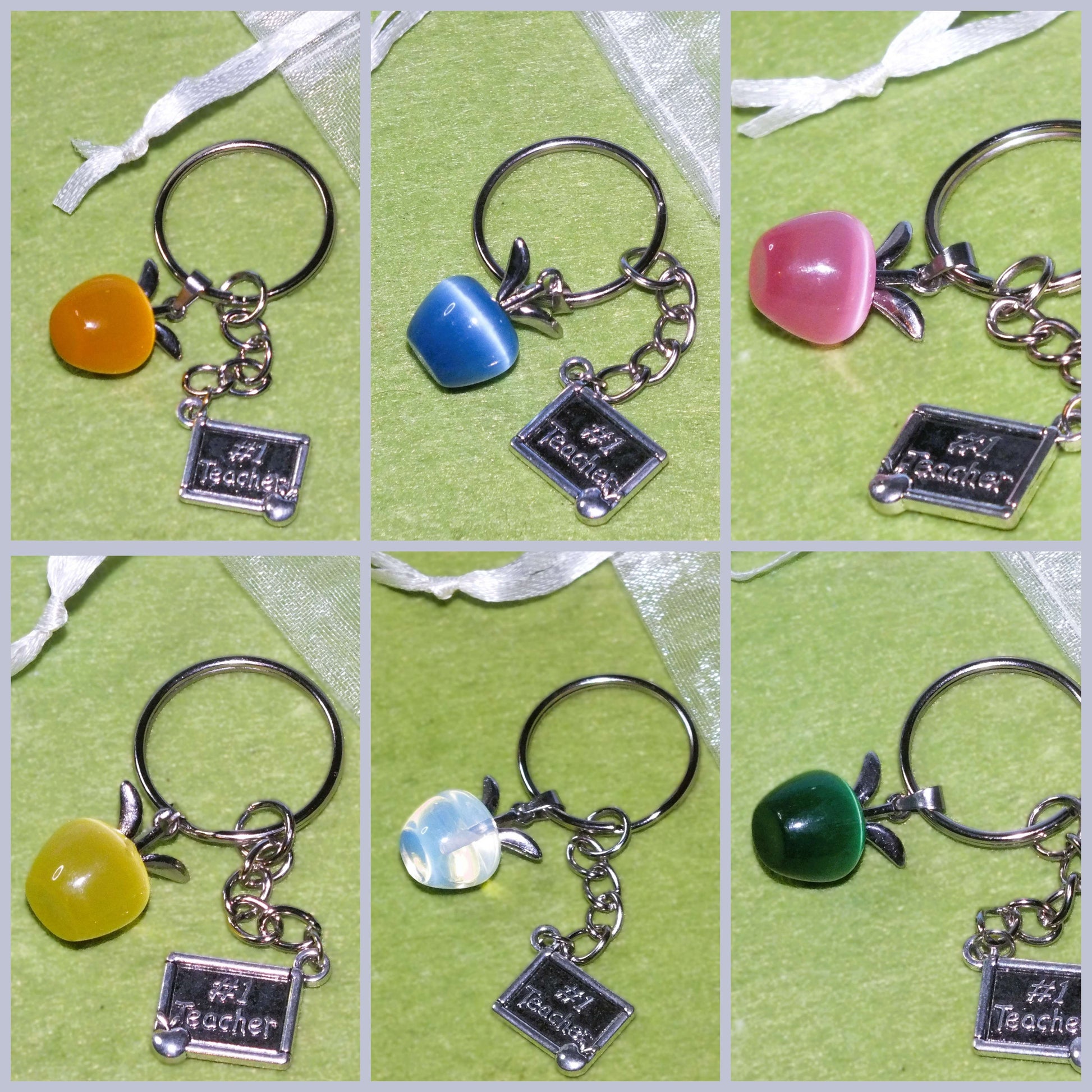 - Keyring detail - Silver tone keyring with an opalite apple charm and a '#1 teacher' charm, presented in a pretty organza bag.