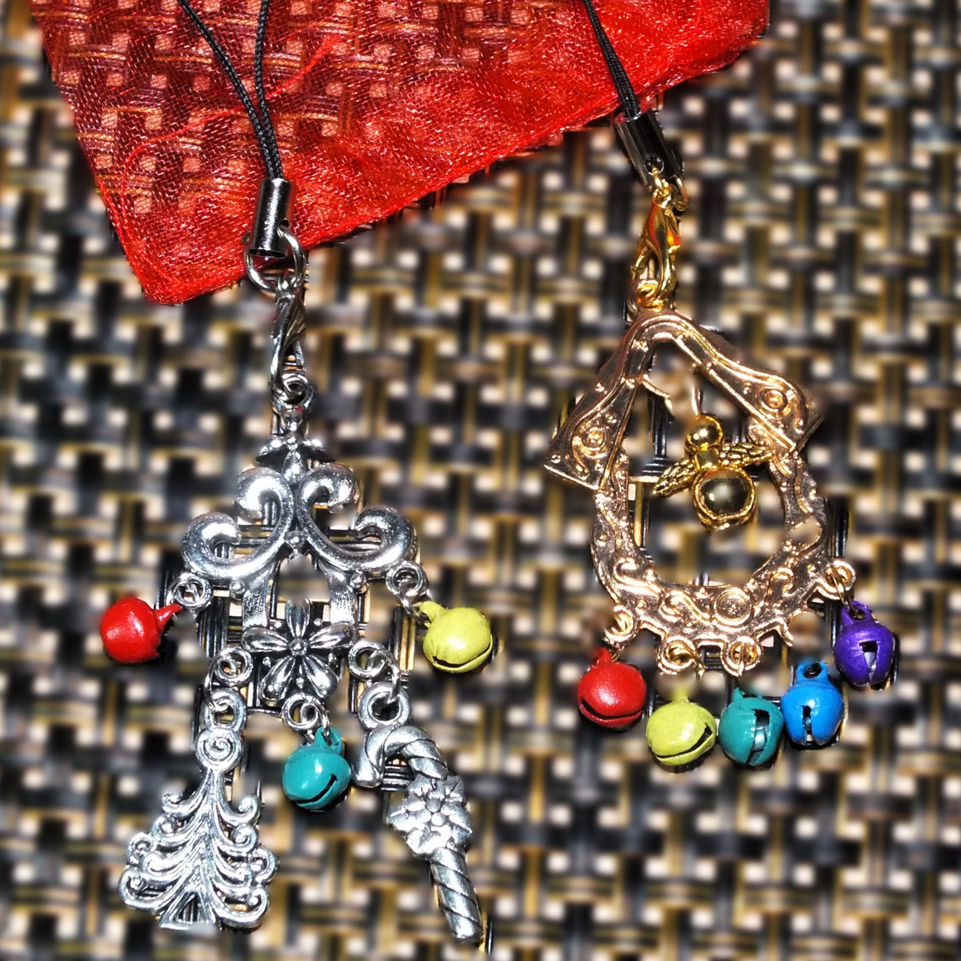 2x Festive handmade charms with bells, angel, Christmas tree & candy cane, on lanyards.