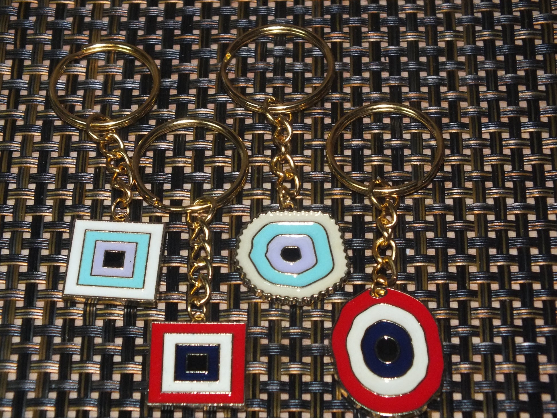 4 x Attractive handmade keyrings, gold tone with a pretty enamel decorated charm on each.