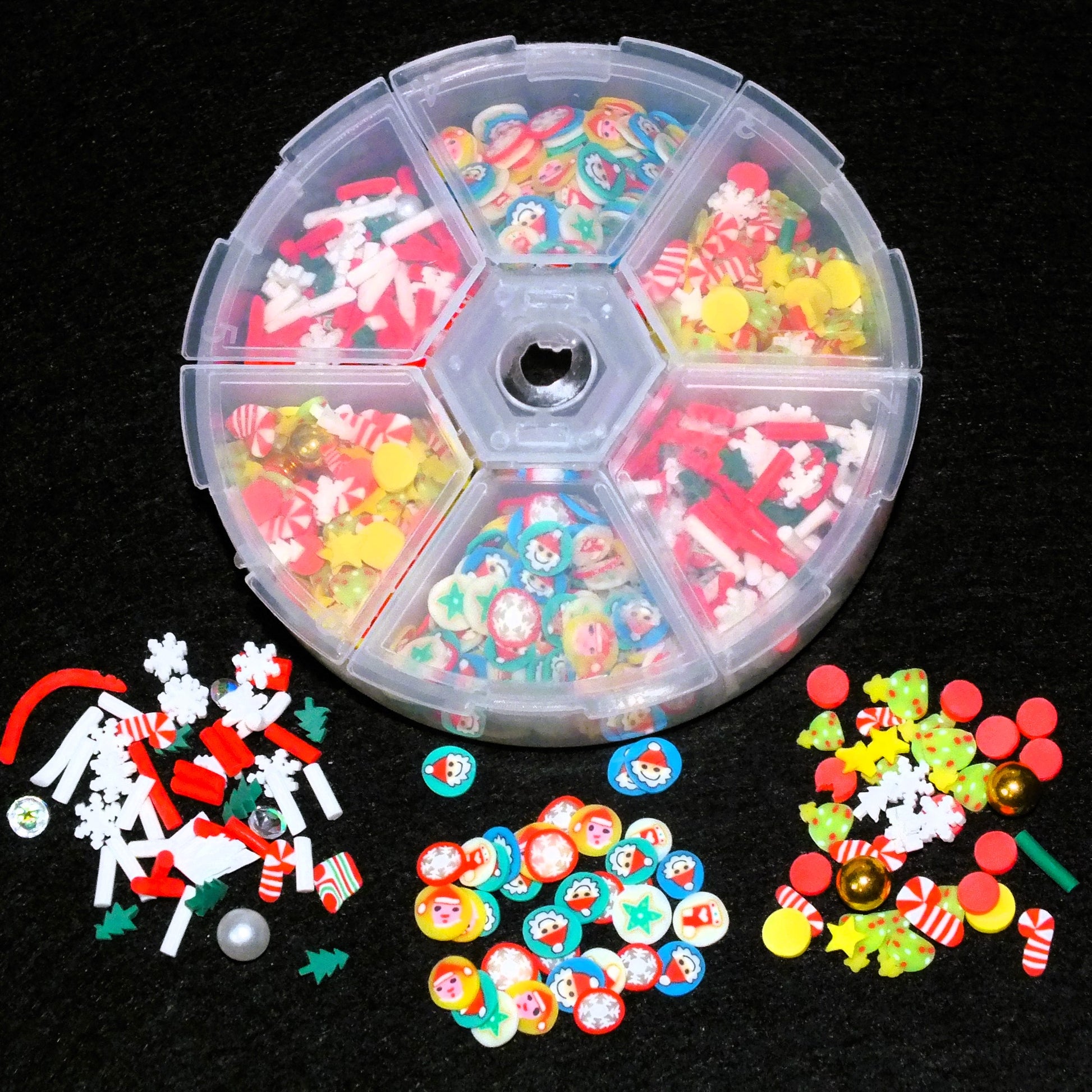 - 6 compartments, each containing 2.4g of festive embellishments / toppers. They are mostly polymer clay, but do include some acrylic beads and other bits and bobs also.
