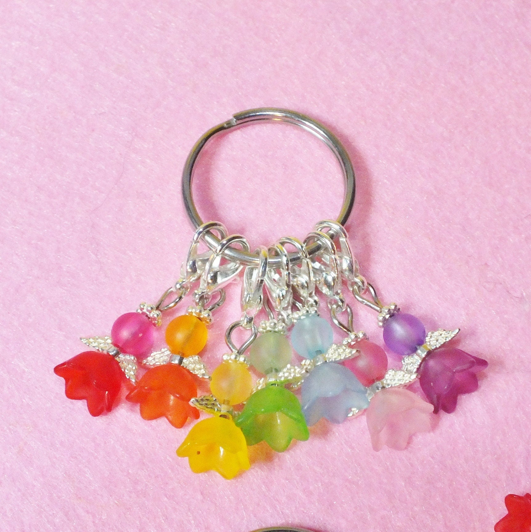 7 Flower rainbow angel stitch markers, handmade, on clasps with keyring.