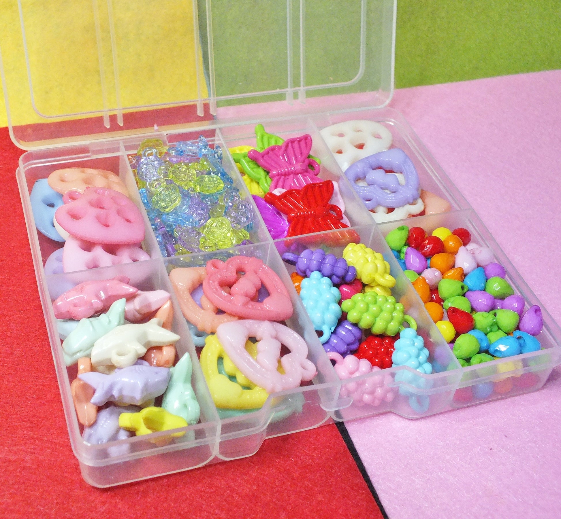 256pc mixed box of charms - hearts, flowers, butterflies, sharks, grapes, droplets