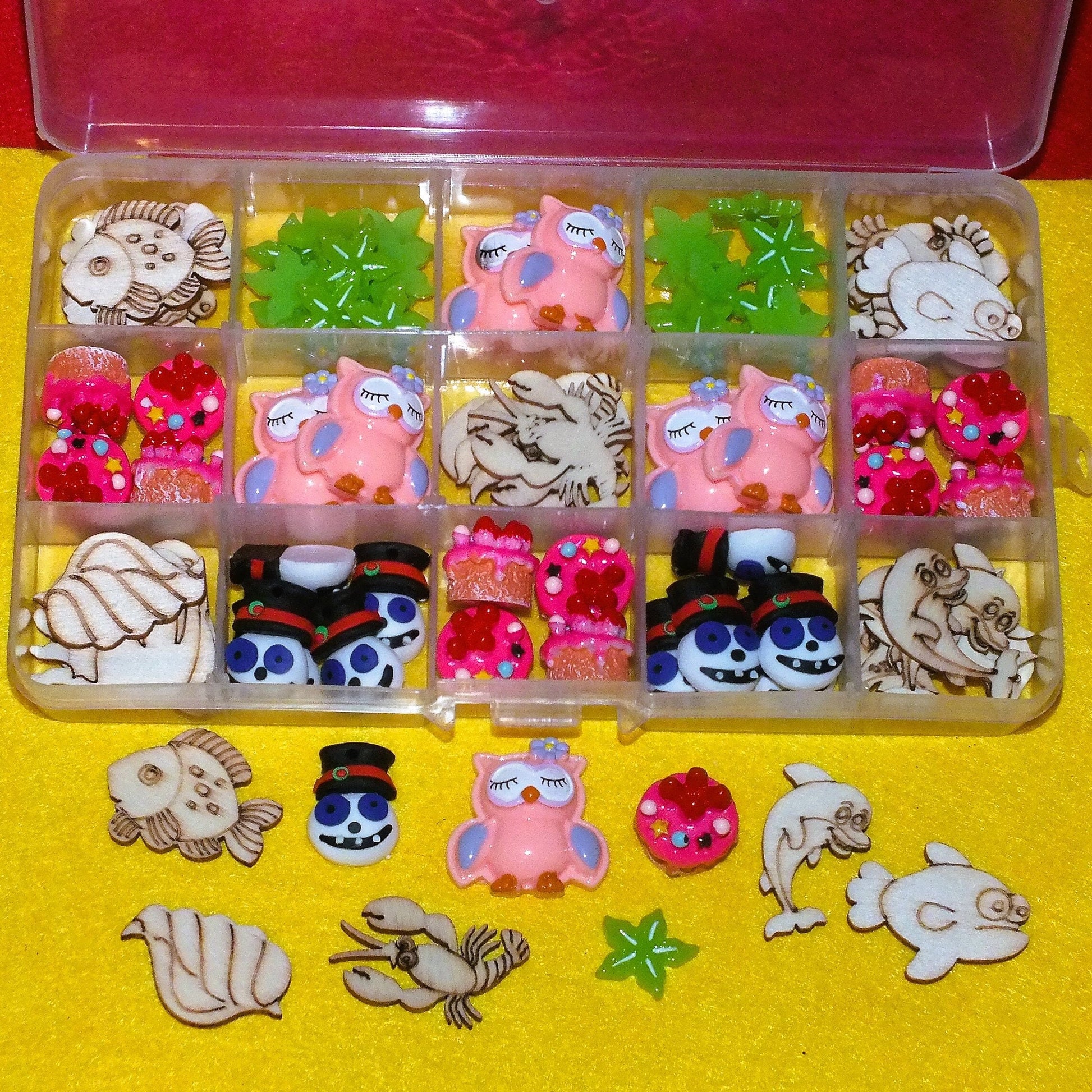 Cabochons box, mix of resin, clay and wood flat backed designs