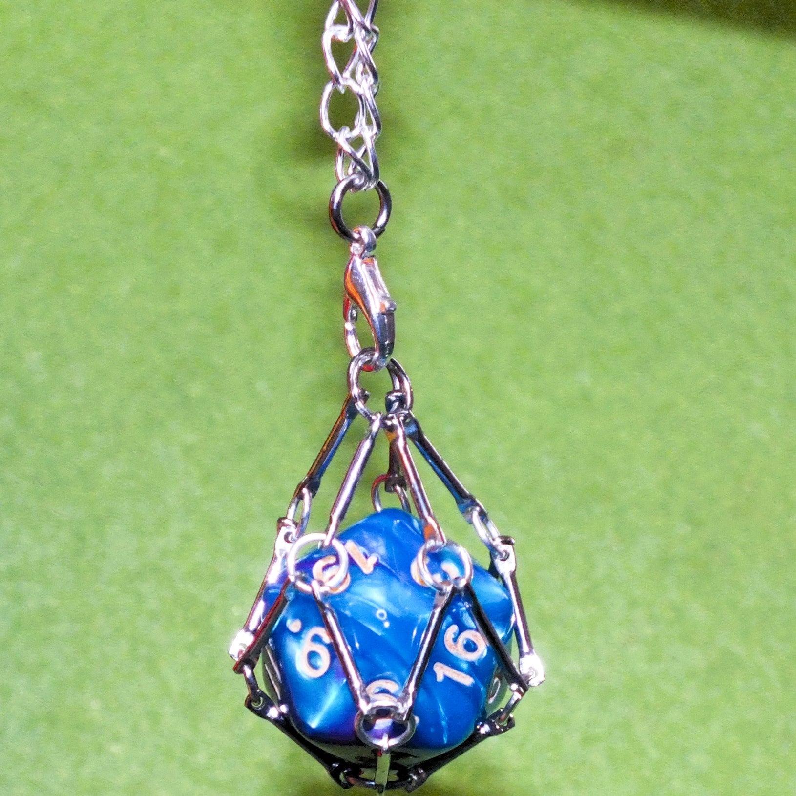 There's a lobster claw clasp at the end of the chain. This holds two metal rings together - these hold the 'cage' of the dice holder keyring in place! If you open the clasp and slip one of these rings out, you'll be able to remove and replace your dice with ease. To secure it again, replace your dice and simply hook the ring you removed back inside the lobster clasp.