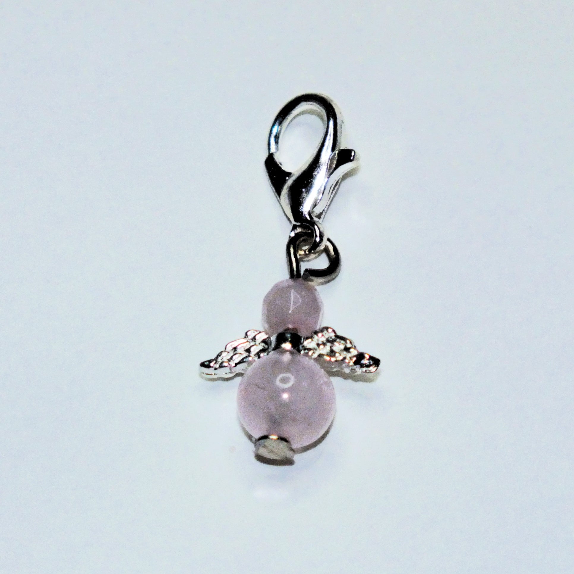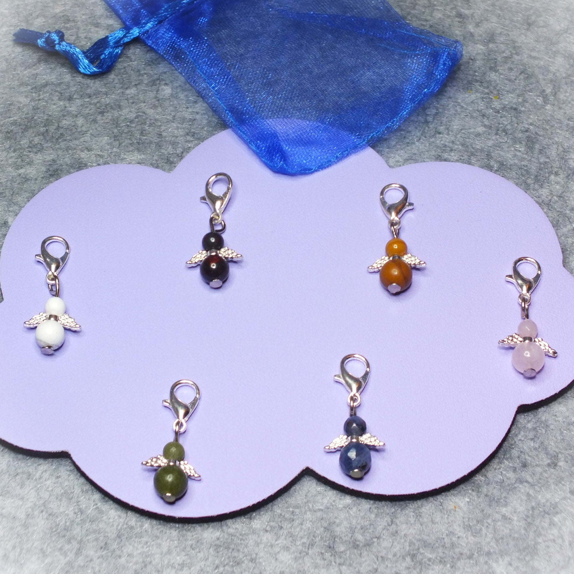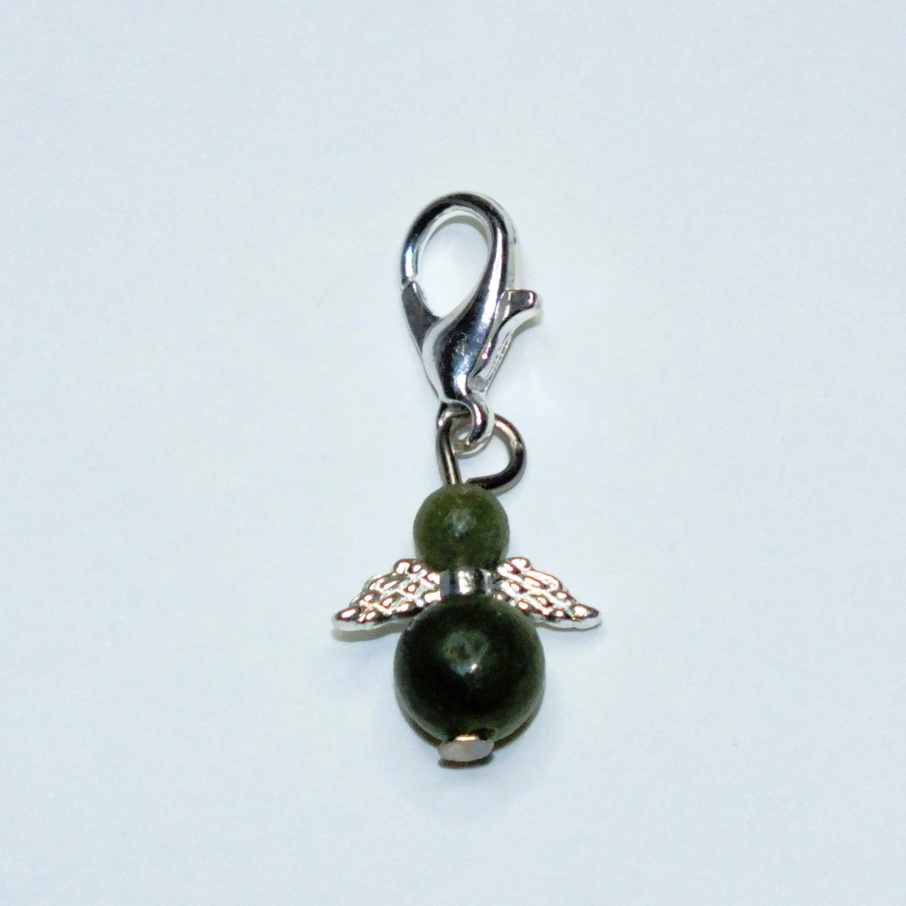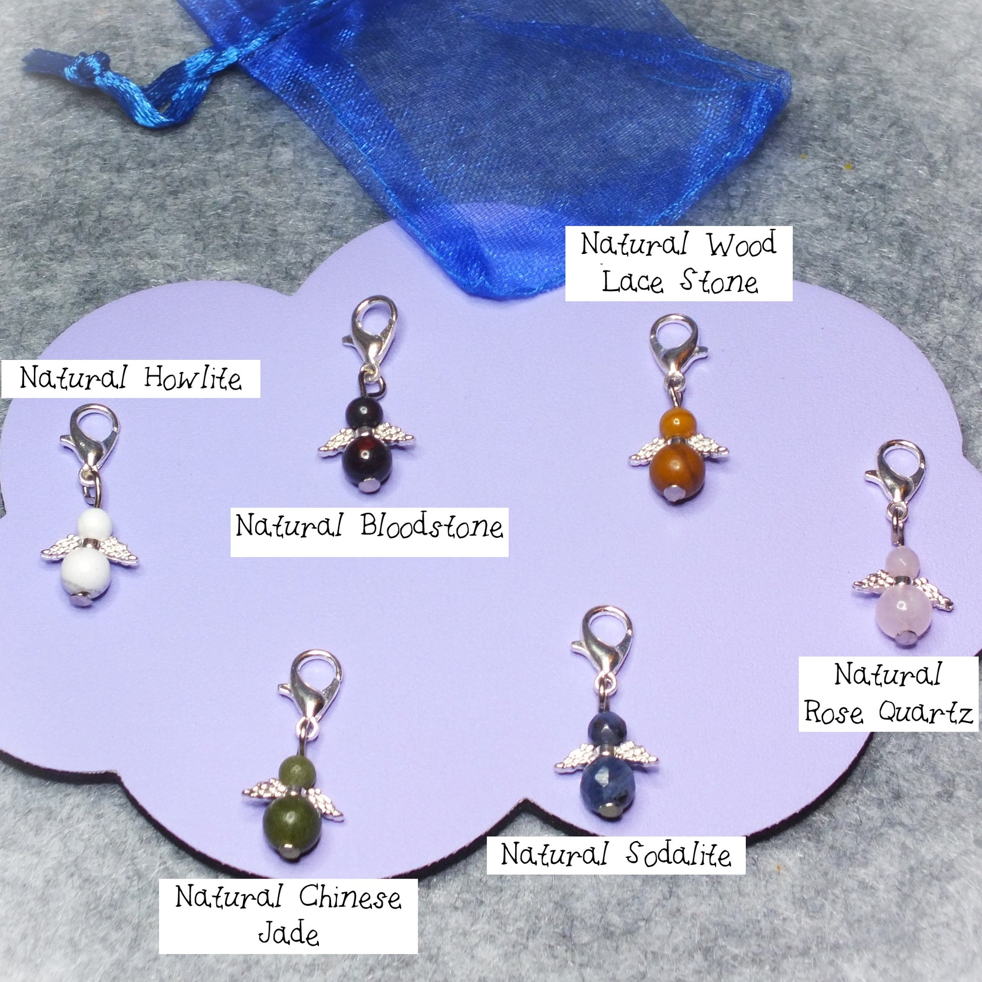 Handmade natural gemstone Guardian Angel charms on clasps - Sodalite, Rose Quartz, Howlite, Bloodstone, Wood Lace Stone, Chinese Jade