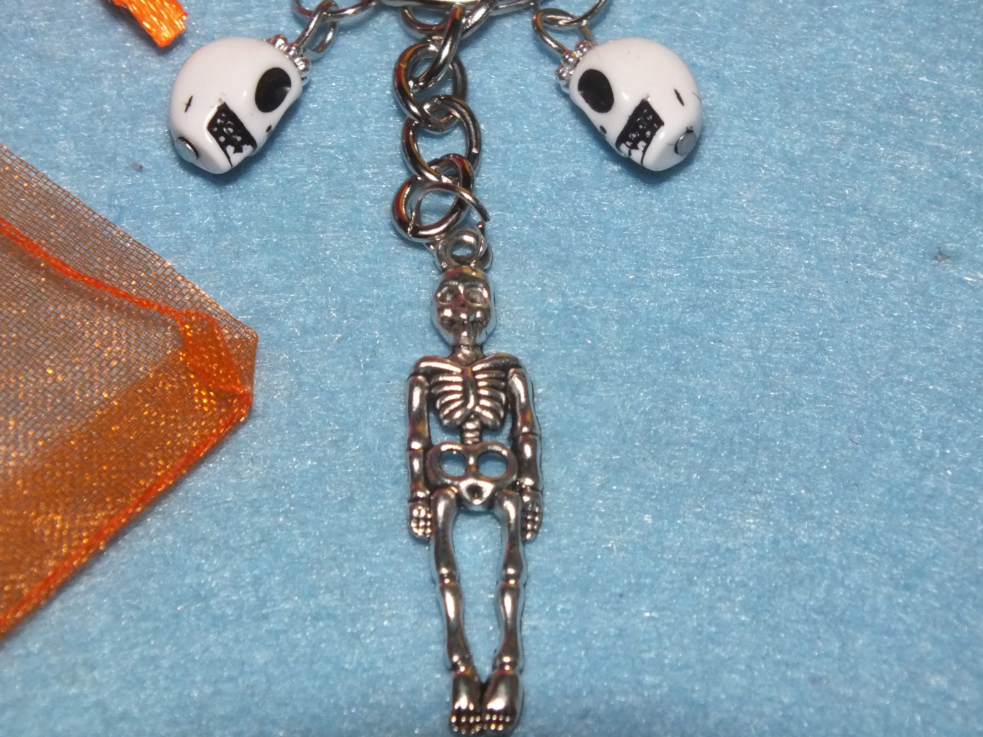 - Details - Handmade spooky halloween skeleton keyring - two acrylic skull charms and a large silver tone metal skeleton charm. Comes in a pretty randomly-coloured organza bag.