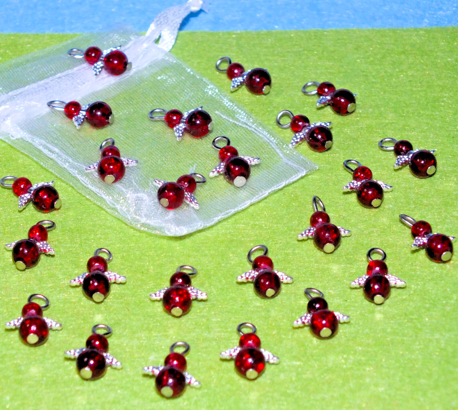 Blood red ice glass angel charms (24-100pcs, plain, on clasps or lanyards)