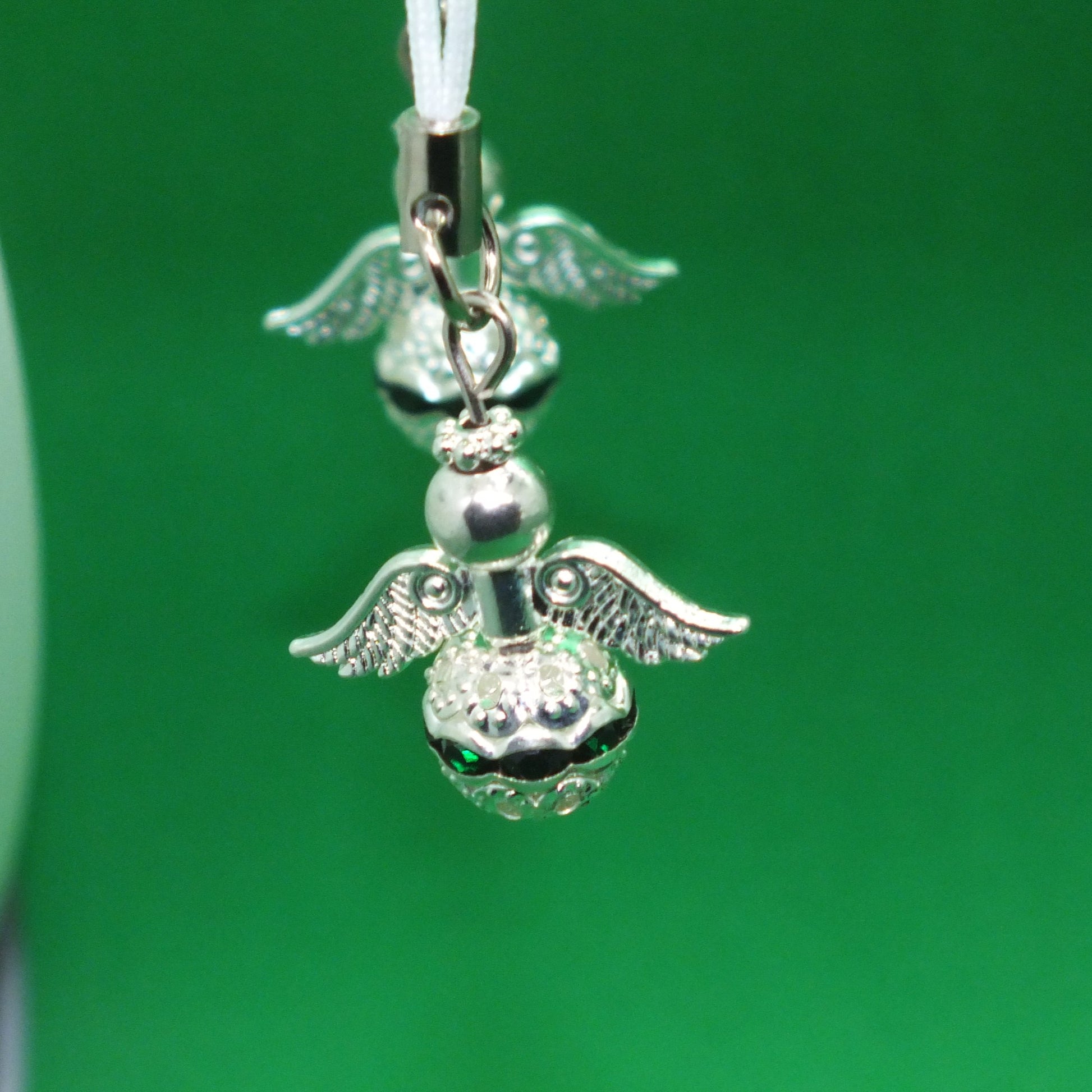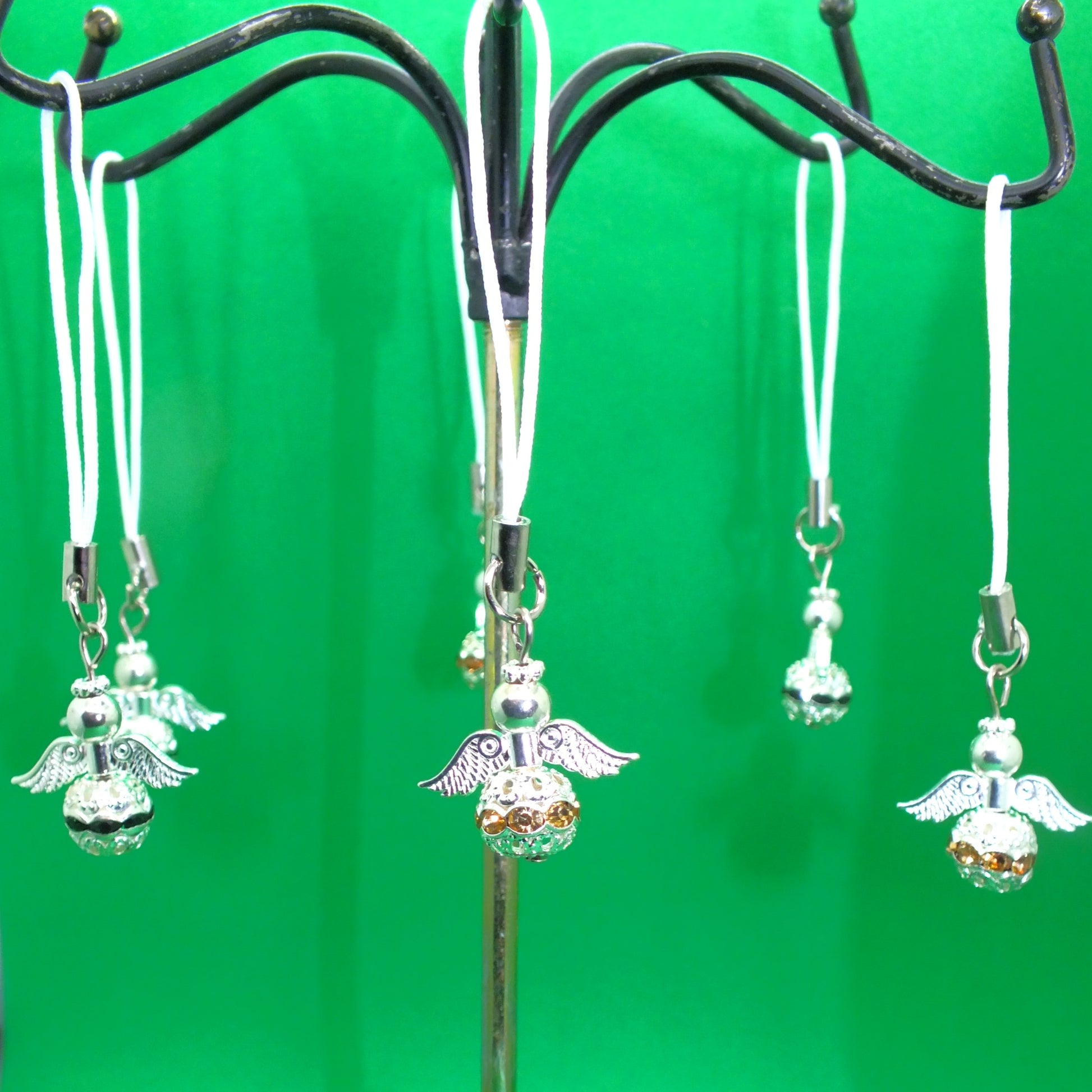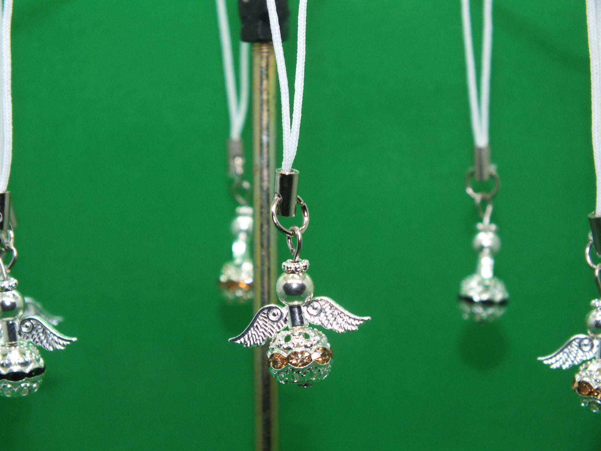 - Charm type - Pack of handmade metal and rhinestone angel charms with silver tone findings and a white lanyard. There are 2 colours of rhinestone highlights - amber and deep green; all packs are half-and-half.