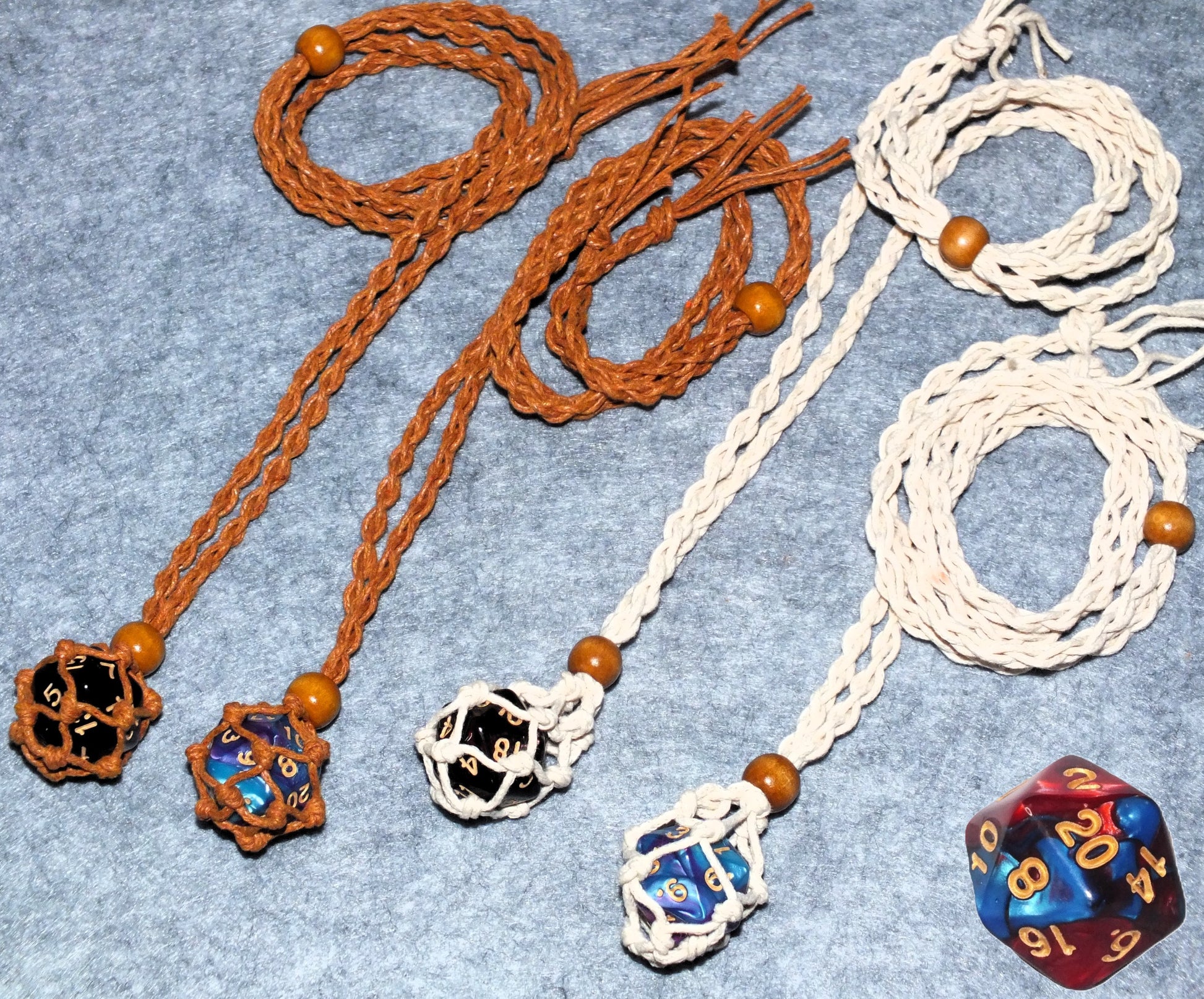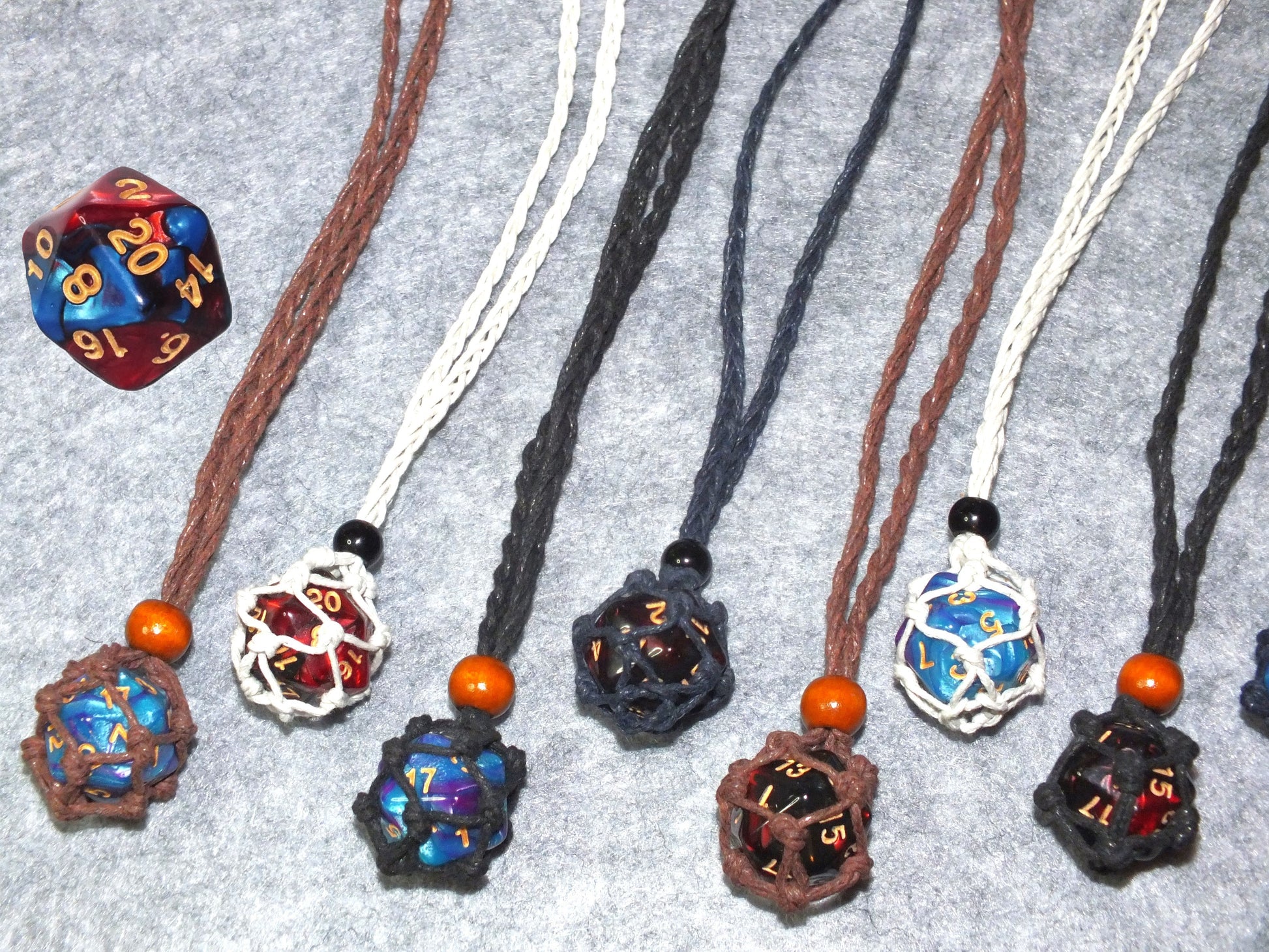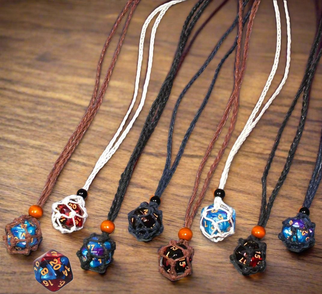 - Adjustable braided waxed cord macrame necklace with d20 holding pouch and a bead closure (different styles/colours; see pics for details!). Includes a standard sized two-tone d20!