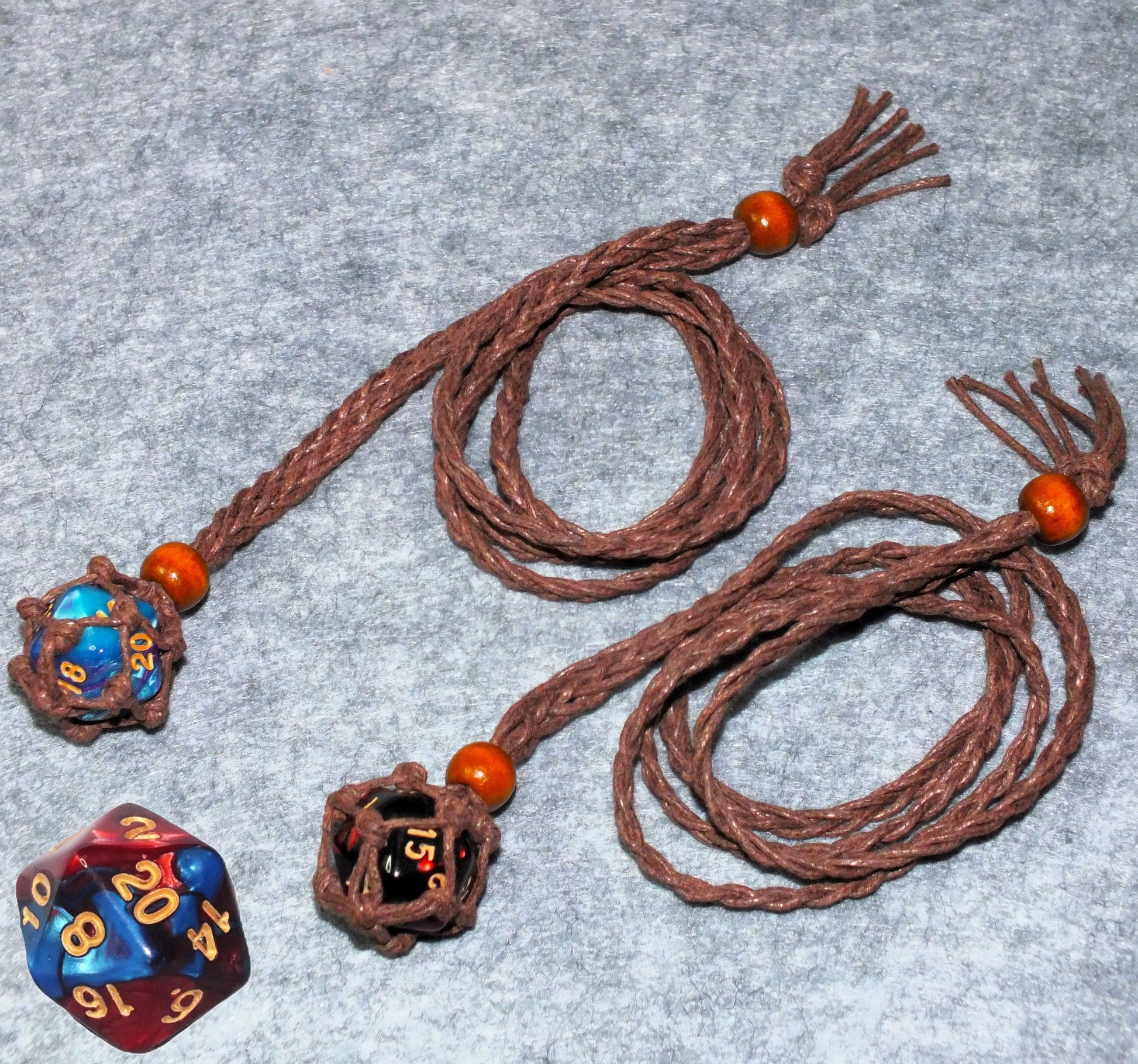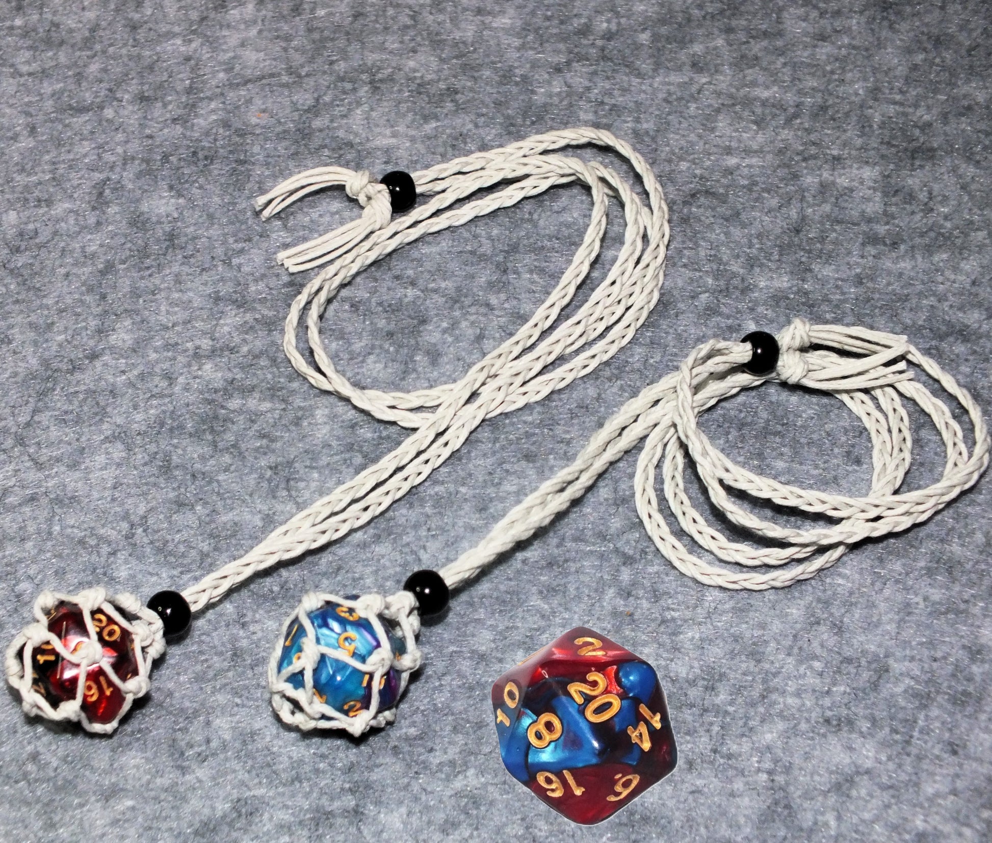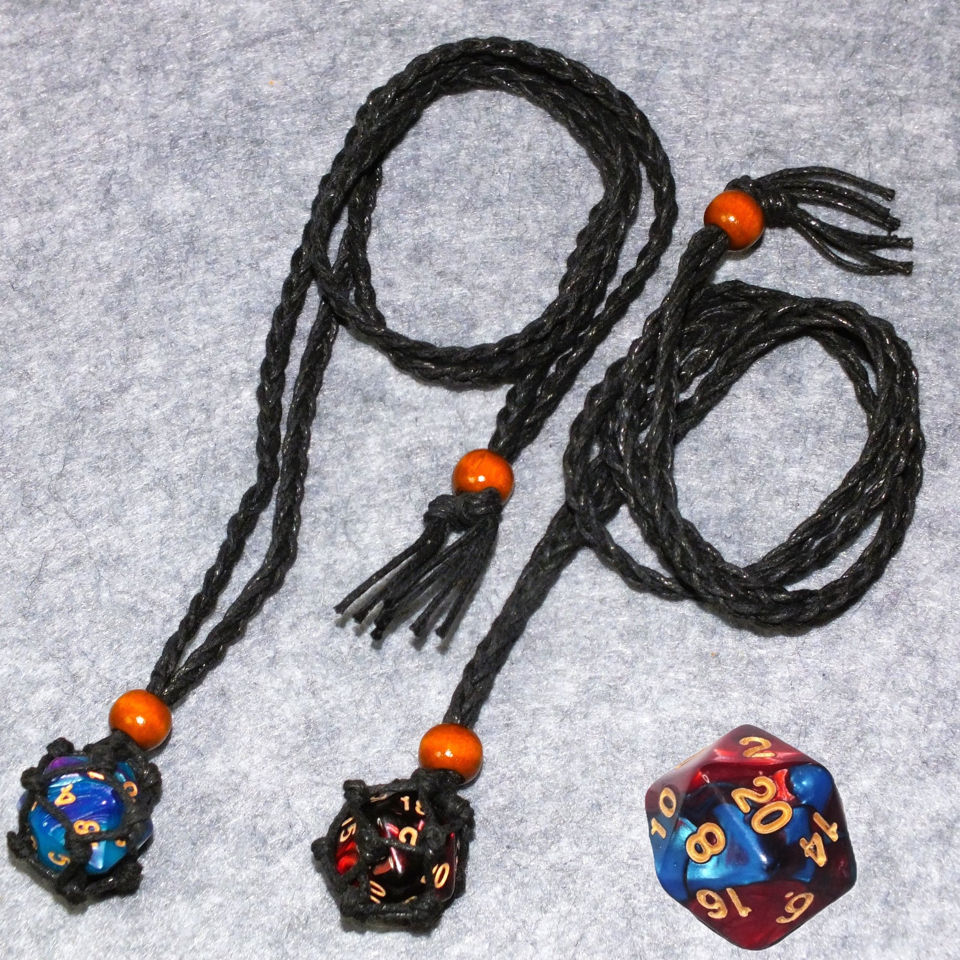 - Adjustable braided waxed cord macrame necklace with d20 holding pouch and a bead closure (different styles/colours; see pics for details!). Includes a standard sized two-tone d20!